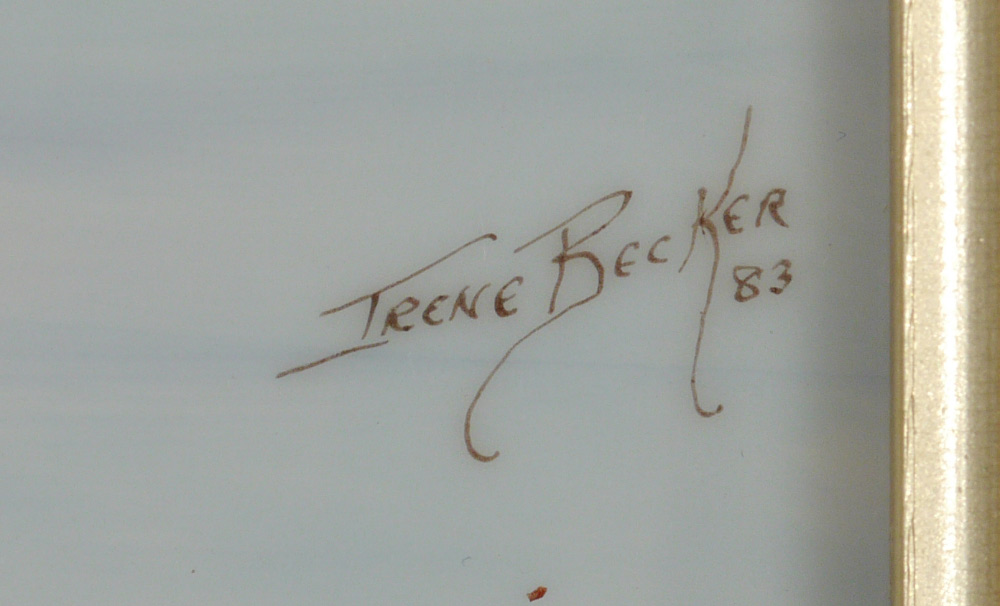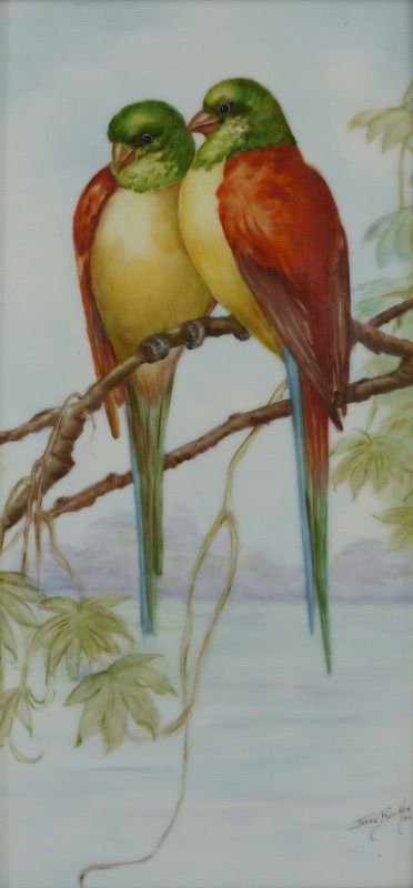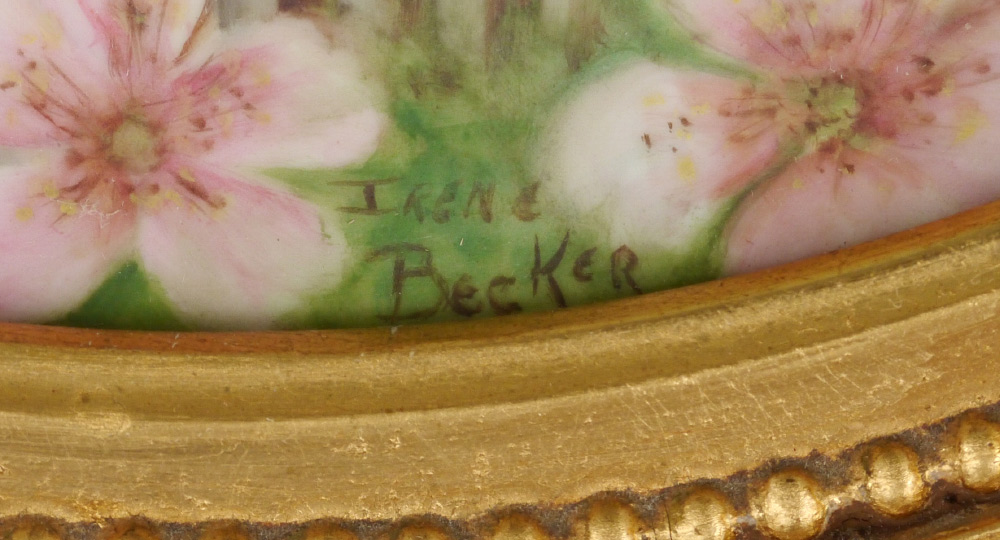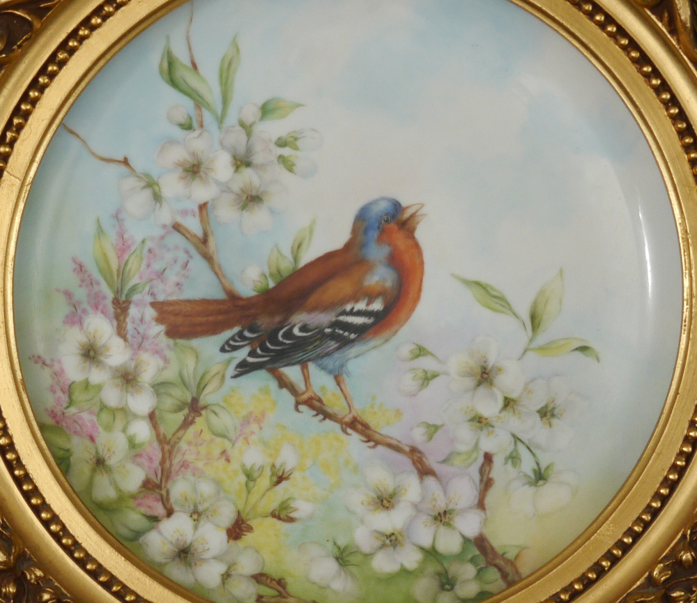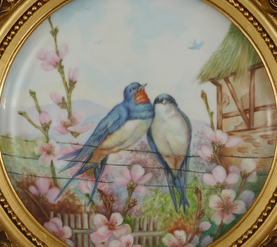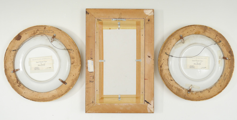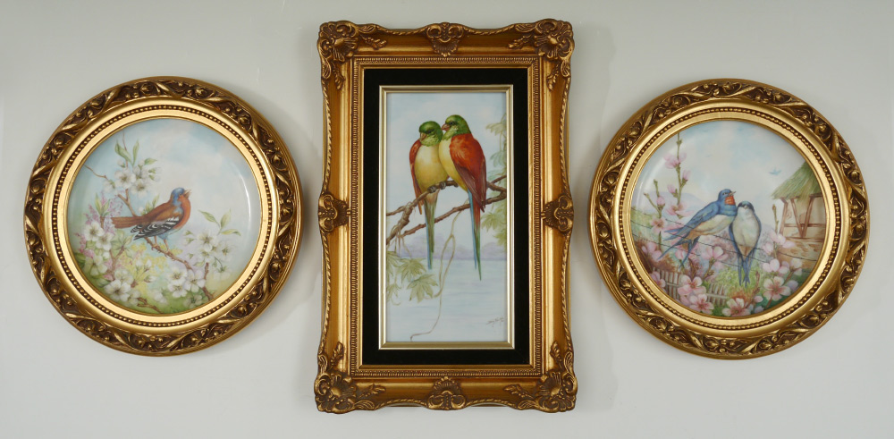 BECKER, Irene (American 1925-2014): Group of 3 painted porcelain plaques depicting birds in ornate gold gilt frames. Signed by the artist. Round frames measure 13'' and the rectangular 17 1/2'' x 11 1/2''.