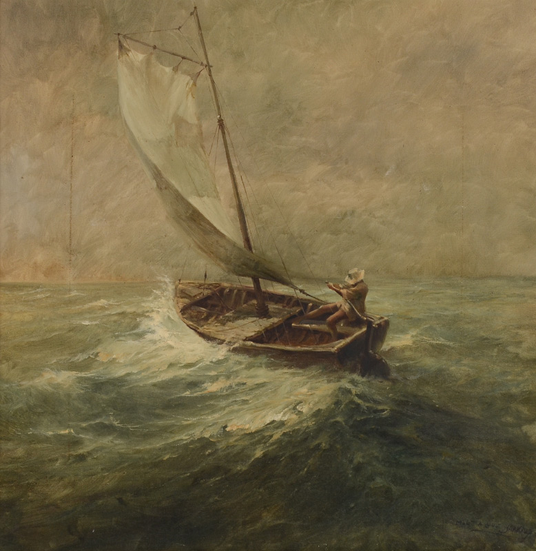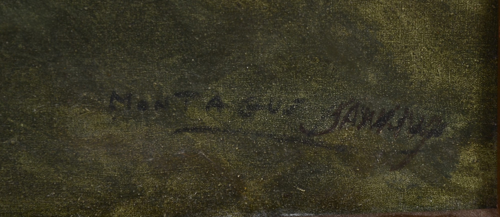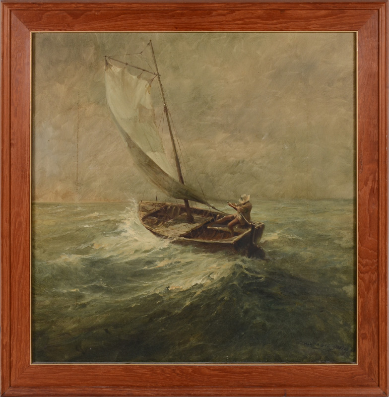 SAILING IN THE STORM PAINTING SIGNED MONTAGUE: Oil/Canvas, 36'' x 35'', signed lower right, wooden frame, 42'' x 41''.