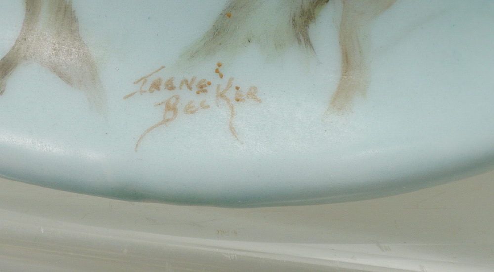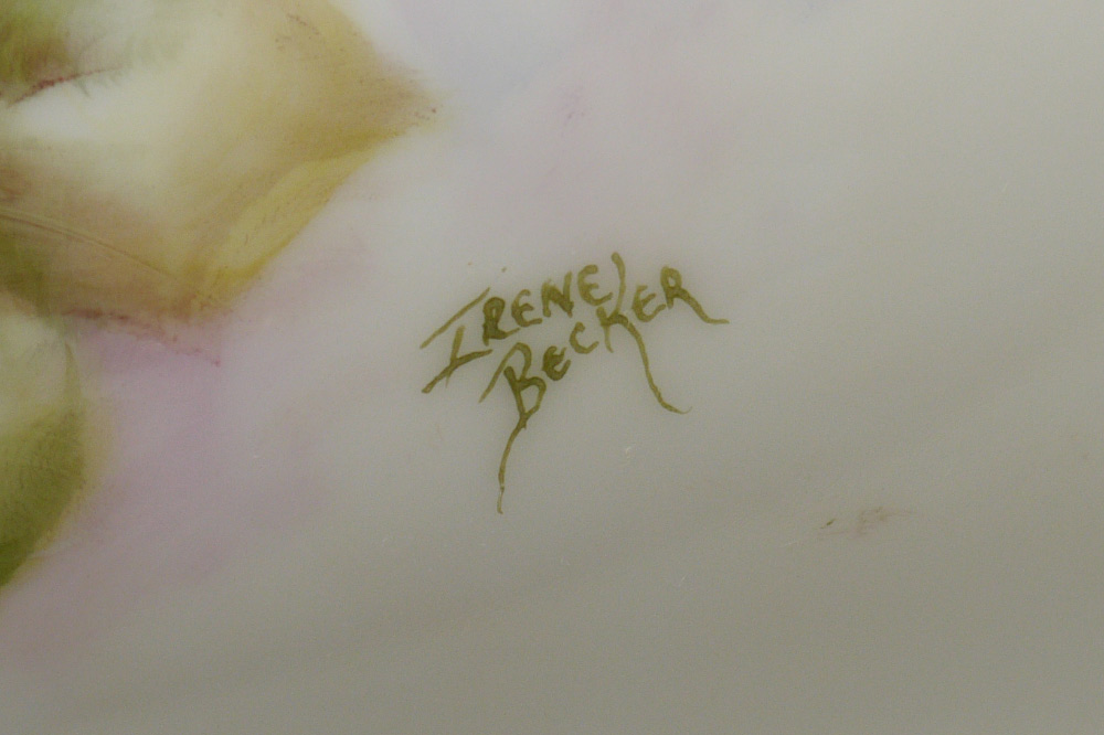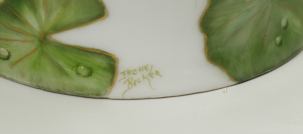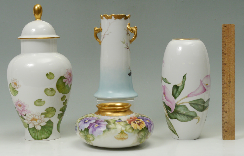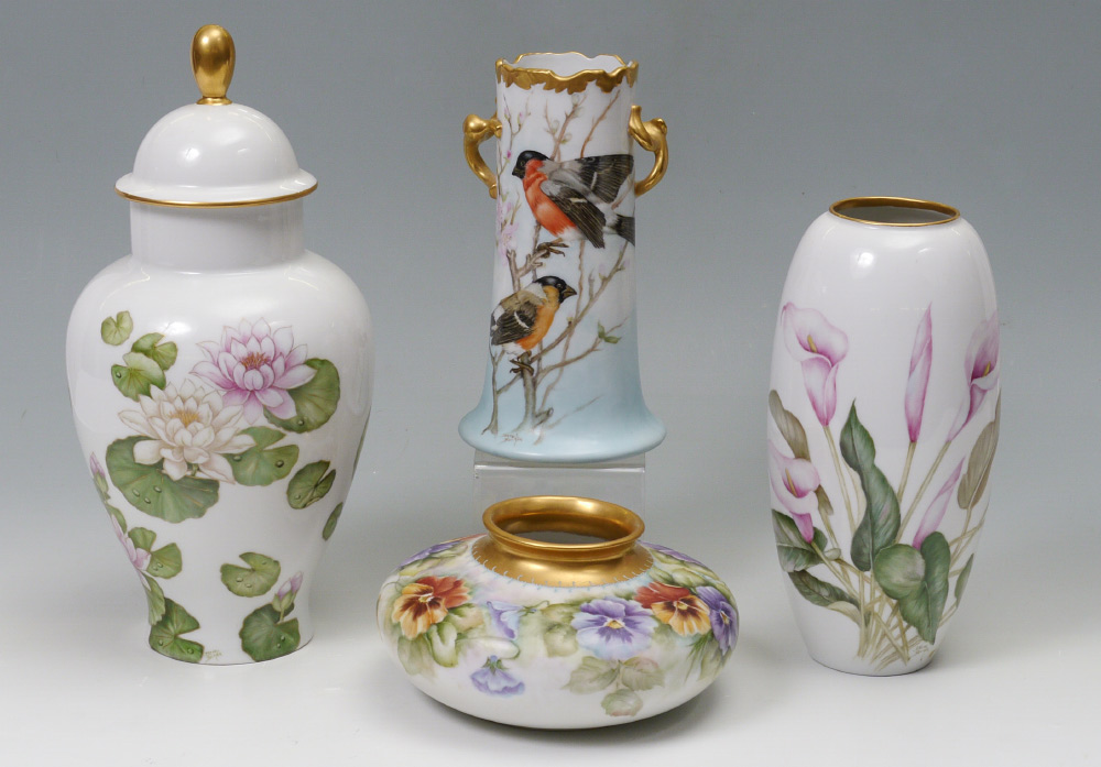 BECKER, Irene (American 1925-2014): 4 piece group of hand painted china. 1) Water lily covered jar, 14'' tall. 2) Heinrich lily painted vase, 12''. 3) Bird decorated vase, 9'' 4) Violet decorated squat vase, 8'' dia.