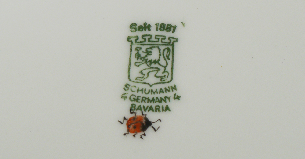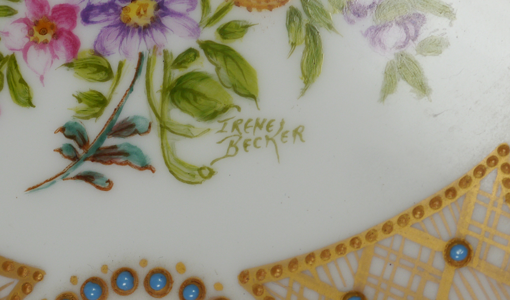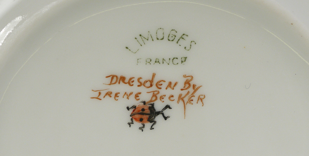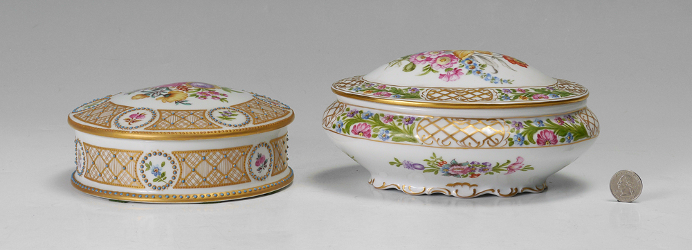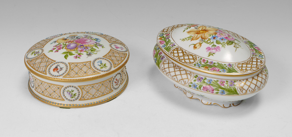 BECKER, Irene (American 1925-2014): Two porcelain boxes hand painted in the Dresden manner. 1) French Limoges round box, 2 1/4'' x 6 1/2''. 2) Schuman Bavarian oval box, 4'' x 8 1/2''. Both signed by the artist and carry the lady bug logo.