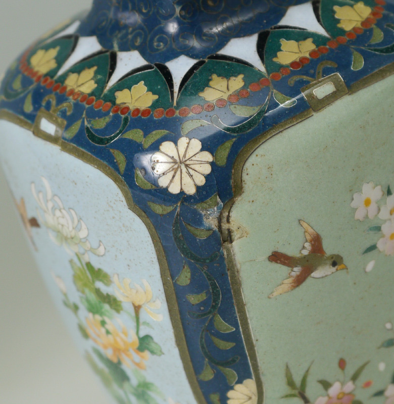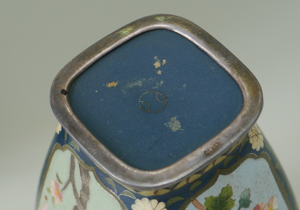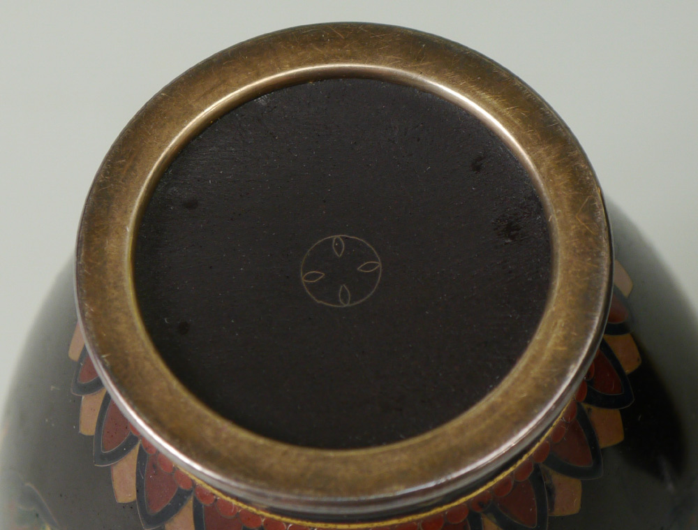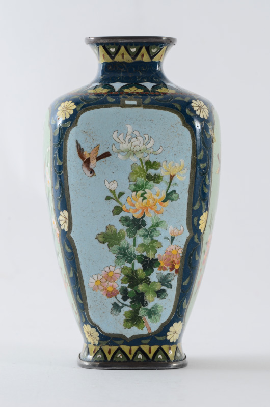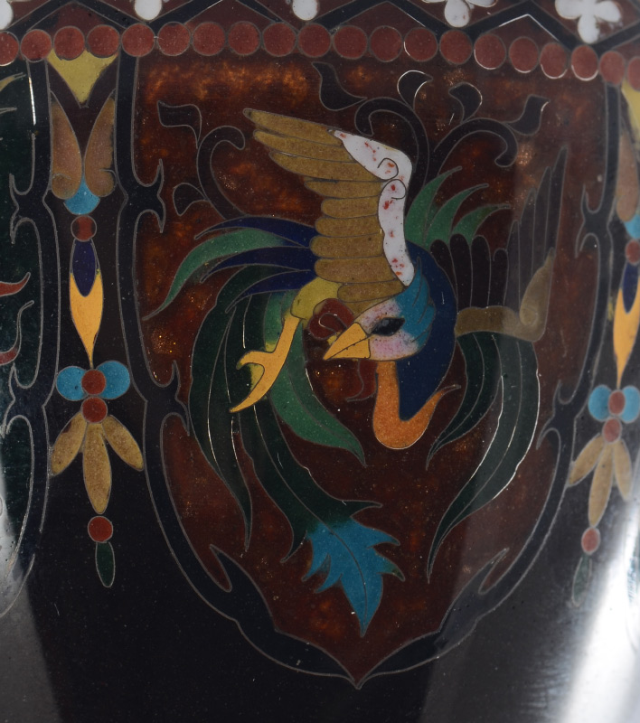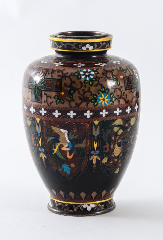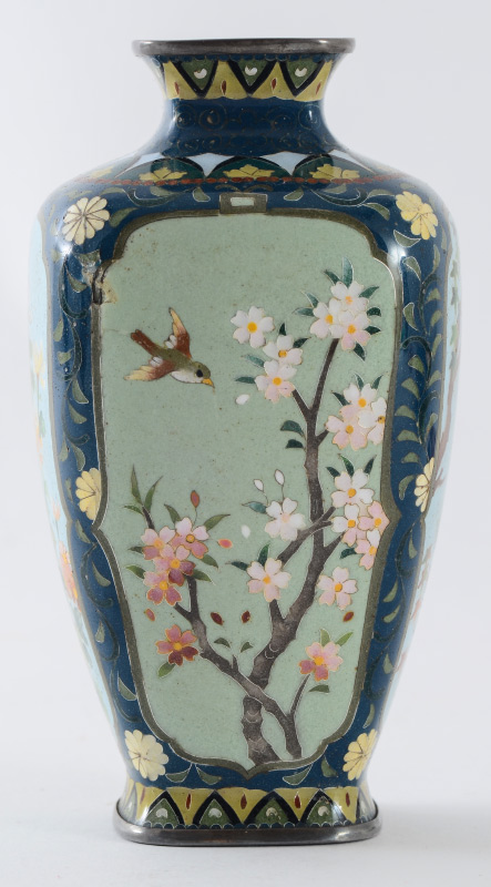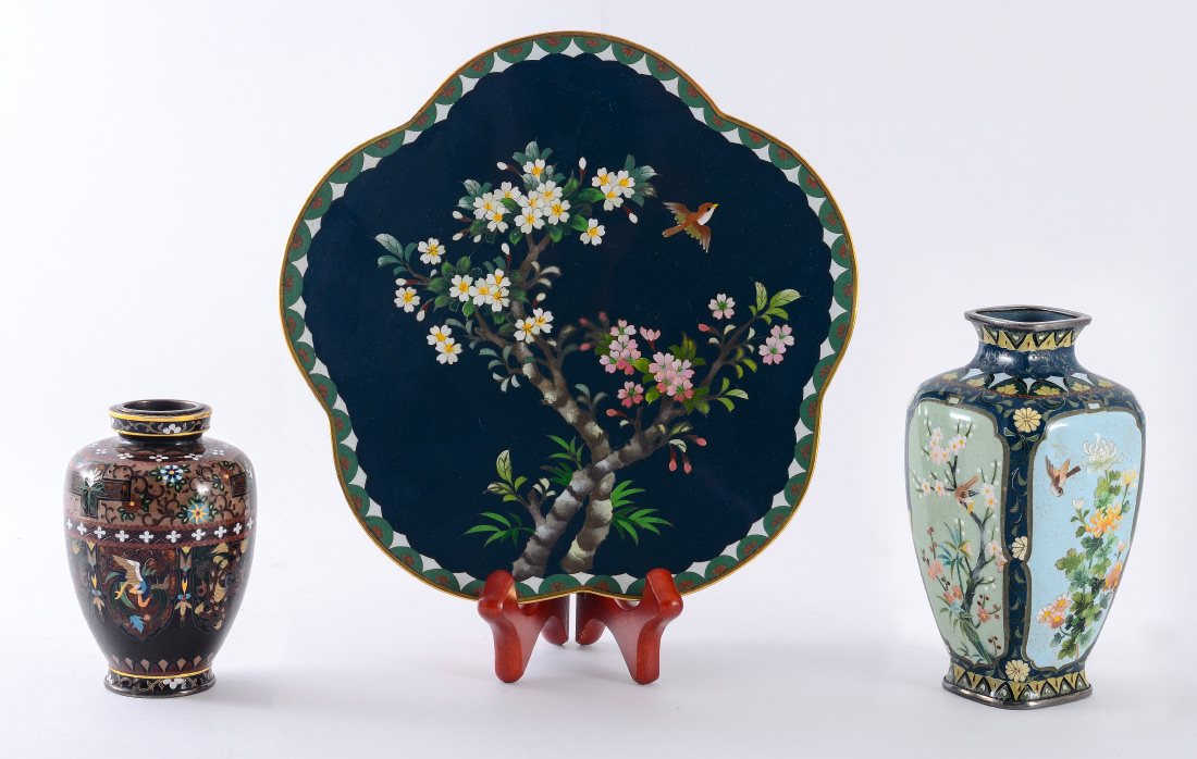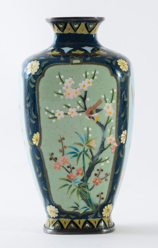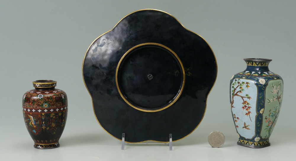 2 SMALL CLOISONNE VASES & A PLATE: 3 pieces total to include 1) Small baluster form vase with detailed floral and alternating dragon and bird in shield motif. Marked on base, 3 1/4'' h. x 2 1/2''. 2) Squared vase with bird in branches panels on each side, marked on base, 5'' h. x 2 1/2''. 3) Rounded 5 corner plate with bird and flowering branches motif, 7 1/2'' dia.