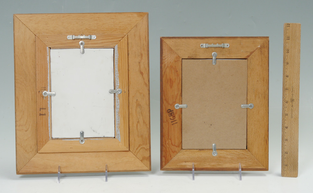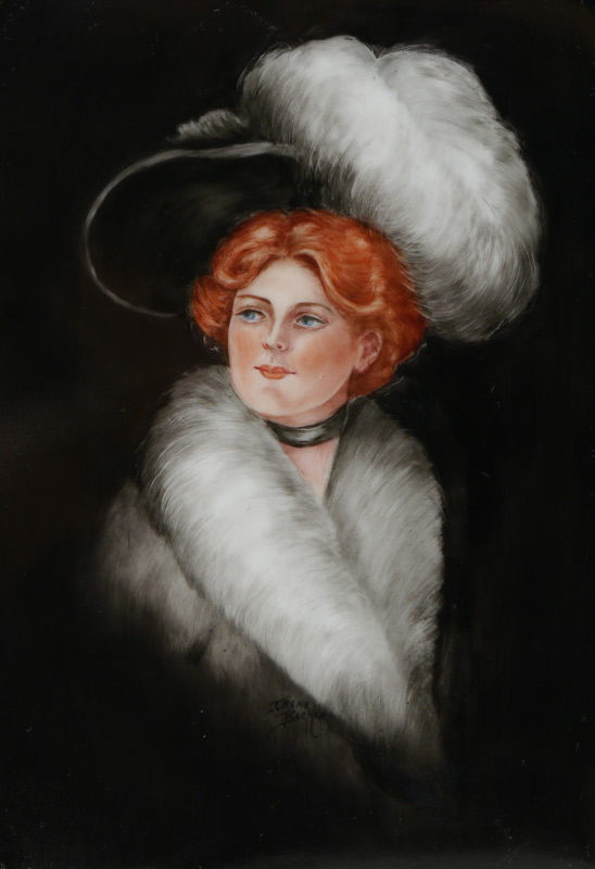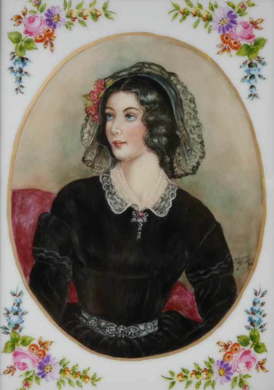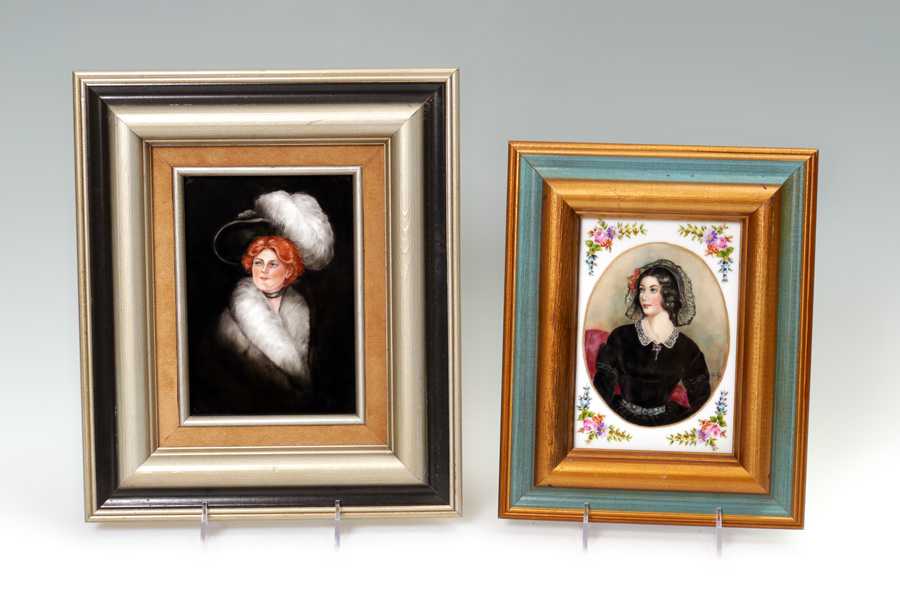BECKER, Irene (American 1925-2014): Painted porcelain plaques depicting women of another era. Signed by the artist. Sight size 6 3/4 x 4 1/2''. Framed, approx. 8'' x 12'' and 11 1/2'' x 9 1/4''.