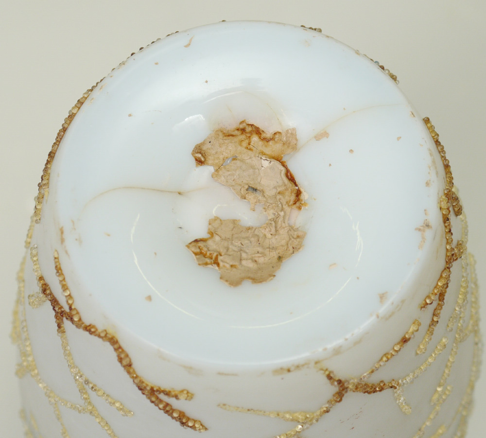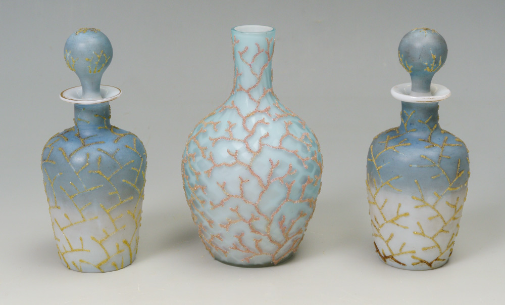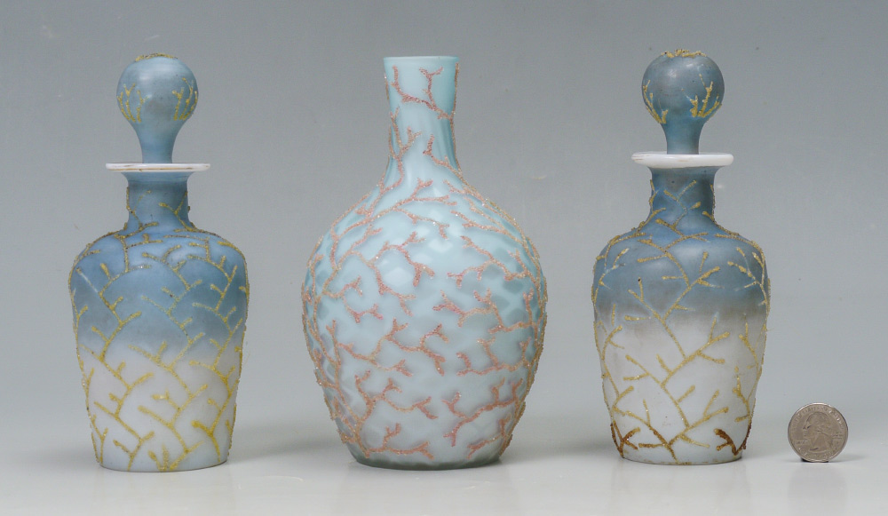 CORALENE VICTORIAN ART GLASS: 3 piece group to include a blue quilted satin glass bottle vase, 8'' tall and a pair of blue colored milk glass bottles with stoppers, 7'' tall.