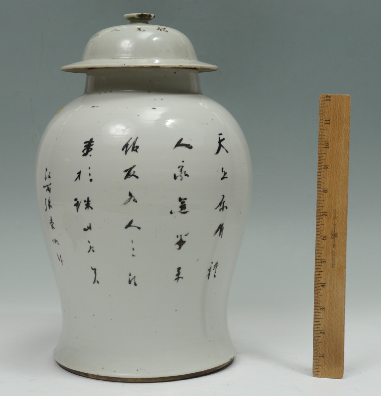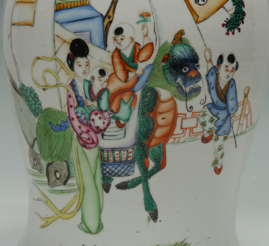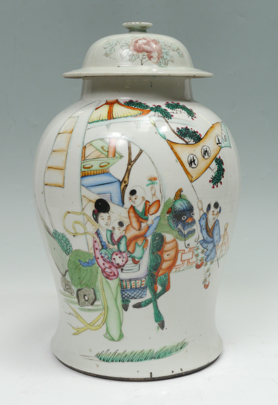 CHINESE POLYCHROME DECORATED LIDDED JAR: Polychrome decorated with outdoor parade scene, unmarked. Overall 15 1/2'' h. x 9 3/4''.