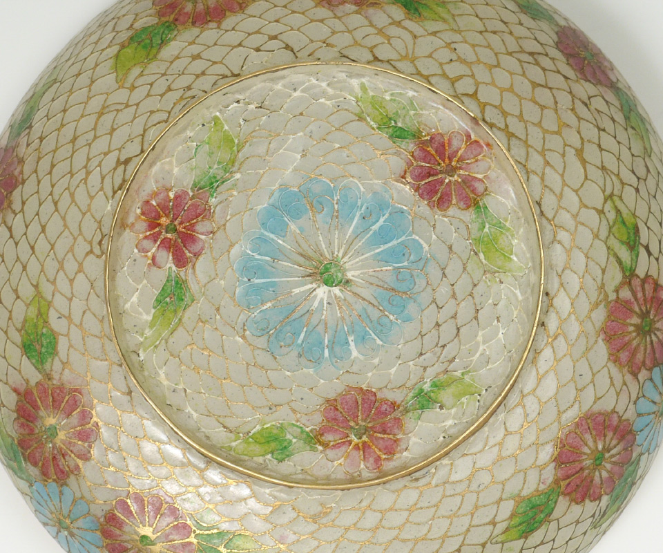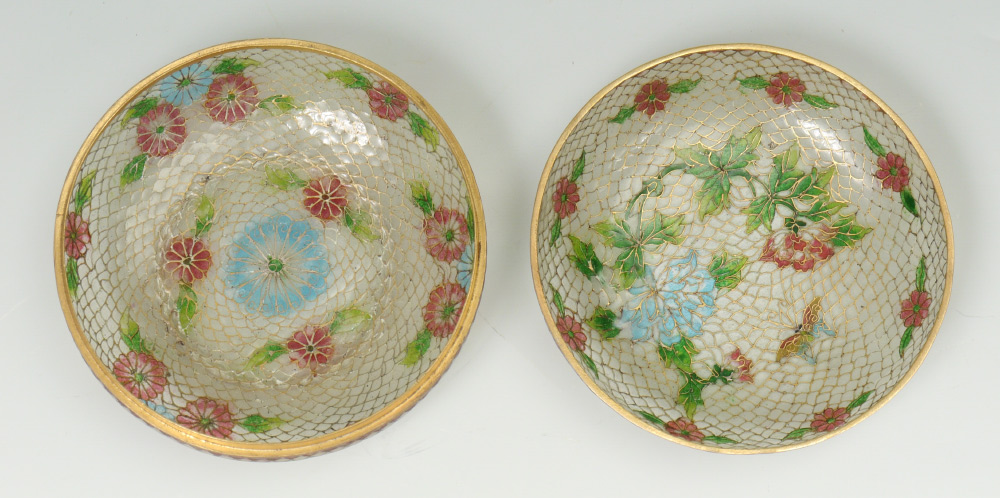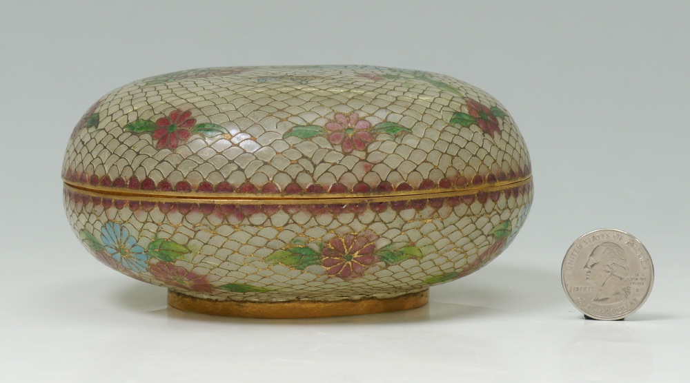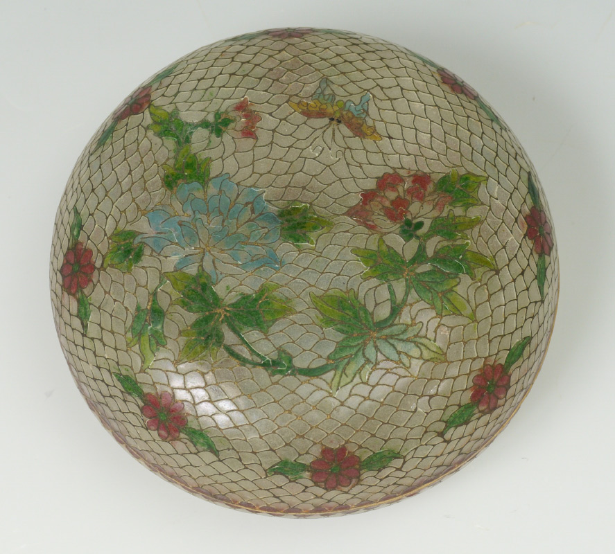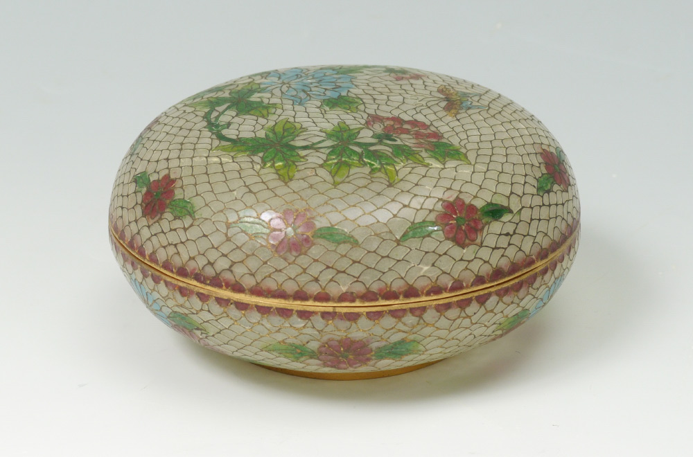 PLIQUE A JOUR COVERED DRESSER JAR: Floral motif with butterfly, 2 1/2'' h. x 5 1/8''.