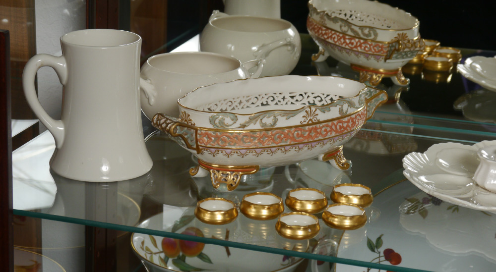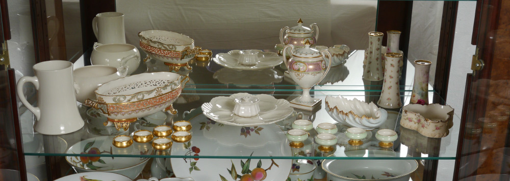 22 PIECE AMERICAN BELLEEK COLLECTION: An assembled collection to include centerpiece with reticulated sides and handles (3 1/2'' h. x 11 1/4'' x 5''), tankard, handled bowl, 12 salts in 2 patterns, oyster plate with condiment server and more.