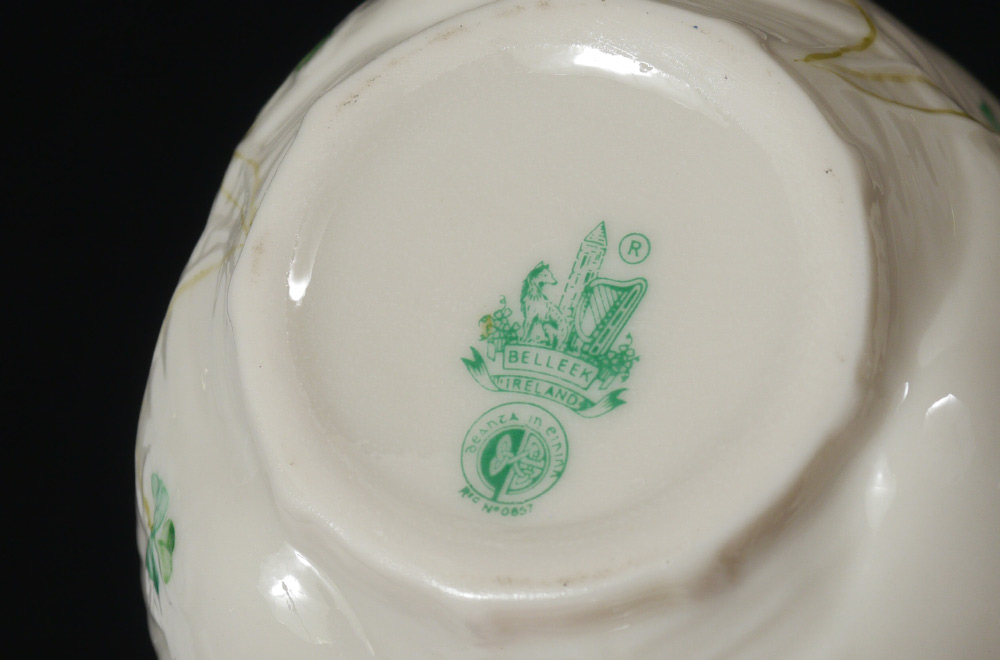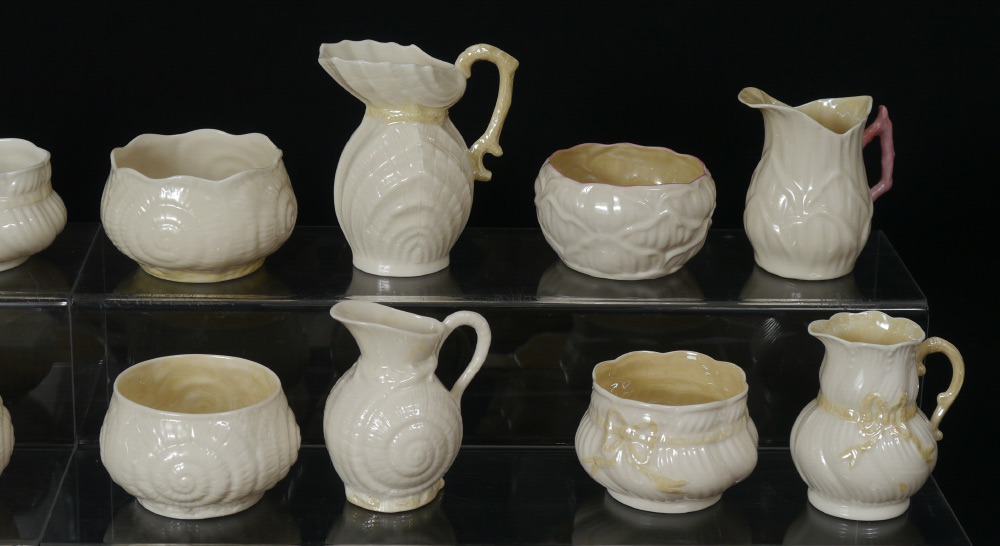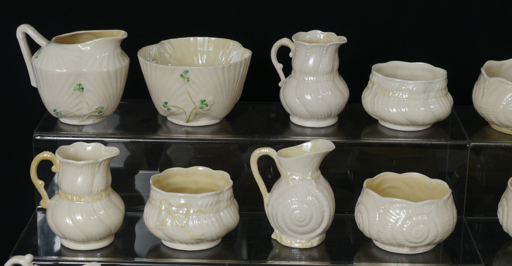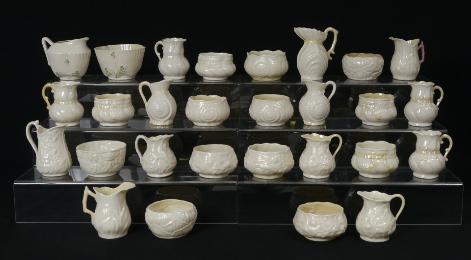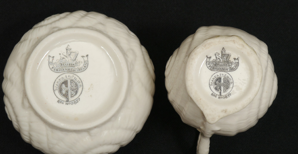 A GOOD COLLECTION OF BLACK MARK BELLEEK PORCELAIN: 14 sets of cream and sugars. Patterns include Mask, Lily (black mark), Ribbon, Shamrock, New Shell and Double Shell. Green marks.