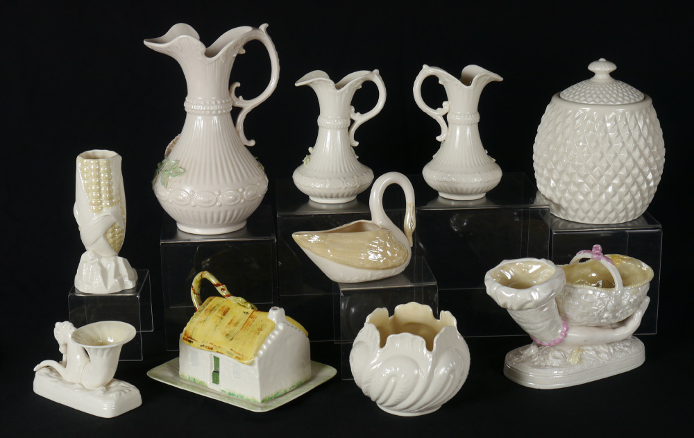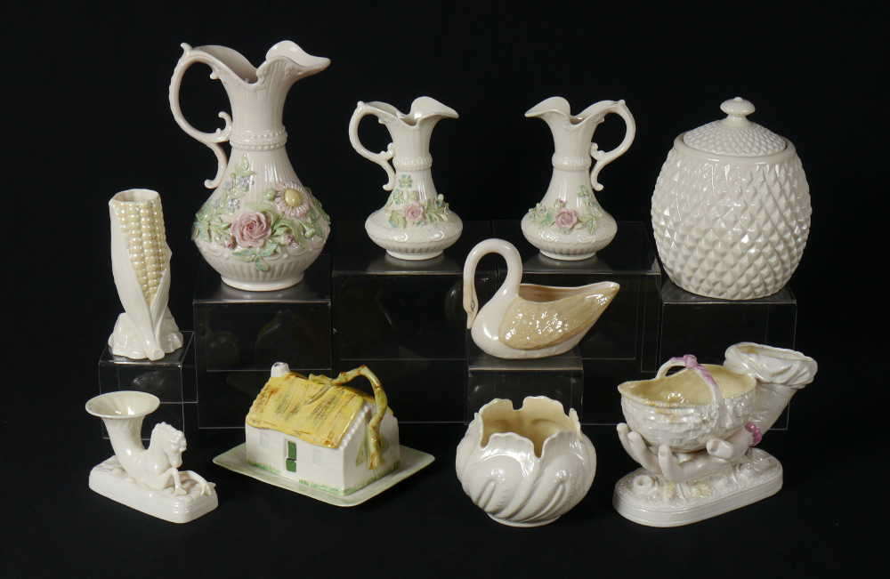 10 PIECE WHIMSICAL IRISH BELLEEK PORCELAIN: To include cottage shaped cheese dish, Indian Corn vase (6''), Swan, Nickle flower pot, Seahorse flower holder, 3 urns with applied flowers (6'' and 9''), hand holding bowl (unmarked), and the Diamond biscuit jar (7 1/2'' tall).