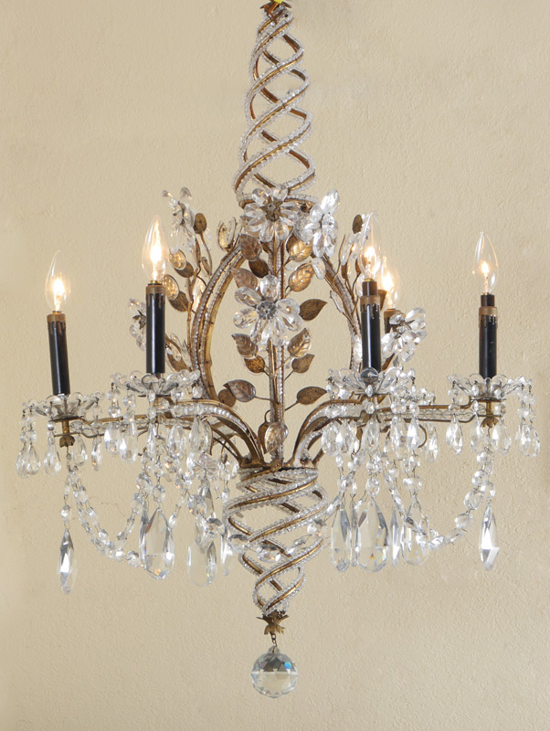 6 LIGHT VENETIAN GLASS CHANDELIER: Faceted glass beads line the gilt metal frame, adorned with flowers made of faceted crystals. Note the unusual spiral stem. Measures approx. 34'' tall x 26'' wide.