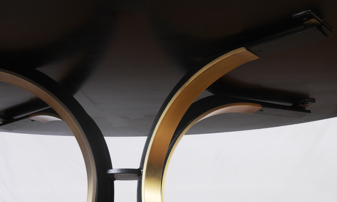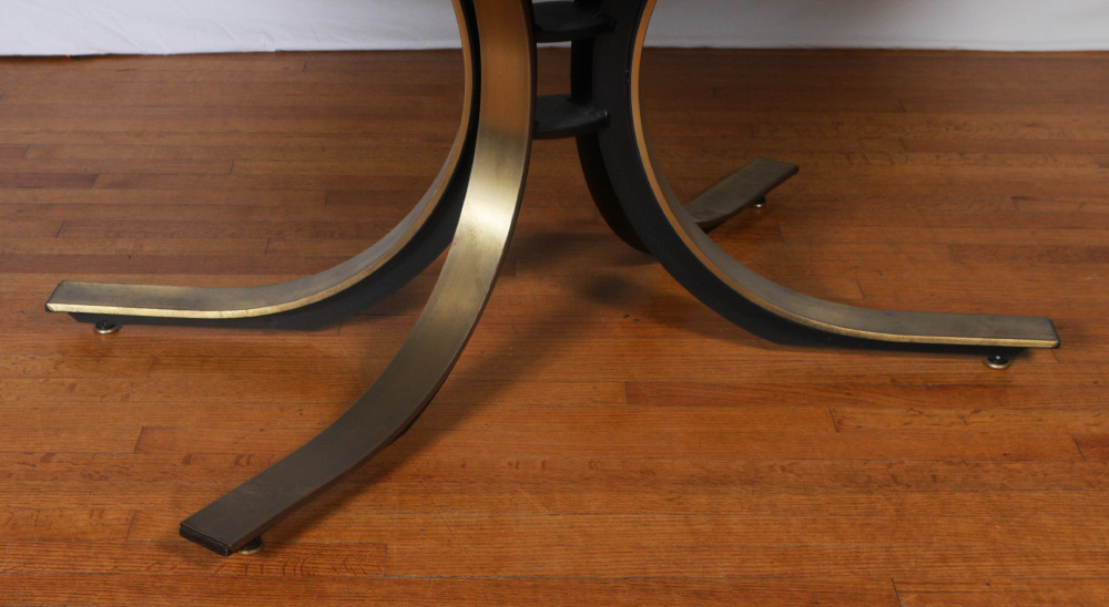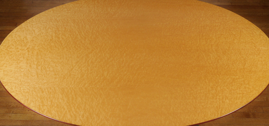 OSVALDO BORSANI FOR STOW & DAVIS DINING TABLE: Stainless steel sculptural base with a birds eye maple top, sold with fitted glass for top. Overall measures 29 1/2'' h. x 78'' x 48''.