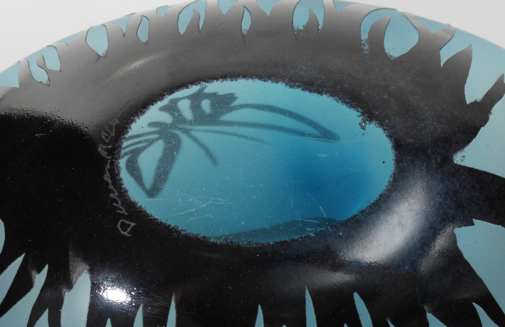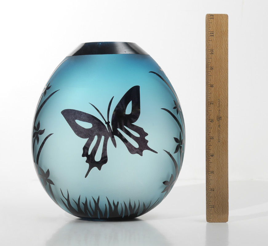 DUNCAN MCCLELLAN BUTTERFLY VASE: Blue frosted glass ground with carved butterflies and flowers motif. Signed on base, 10 1/2'' h. x 9''.