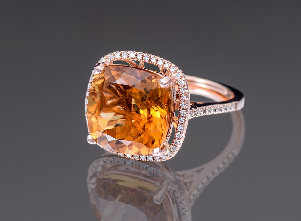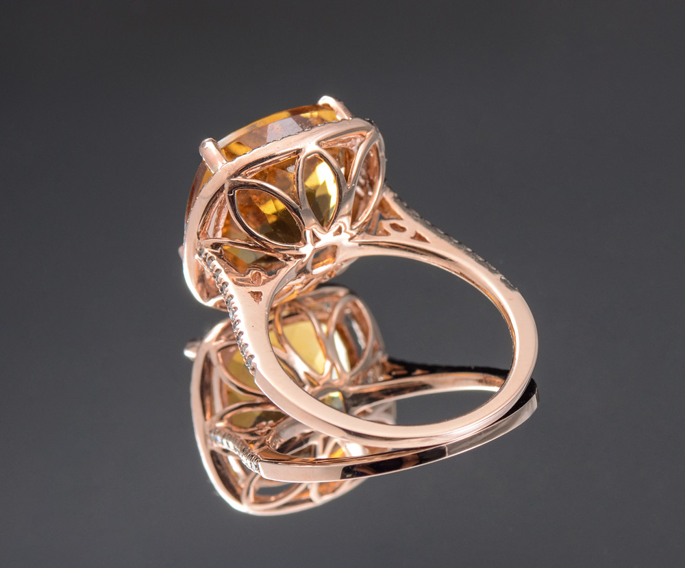 ROSE GOLD 8CT CITRINE RING: Centering an approx. 8 Ct cushion cut Mandarin citrine. The diamonds frame the citrine and extend on the shank. Size 6.5. Weight 5.4 grams.