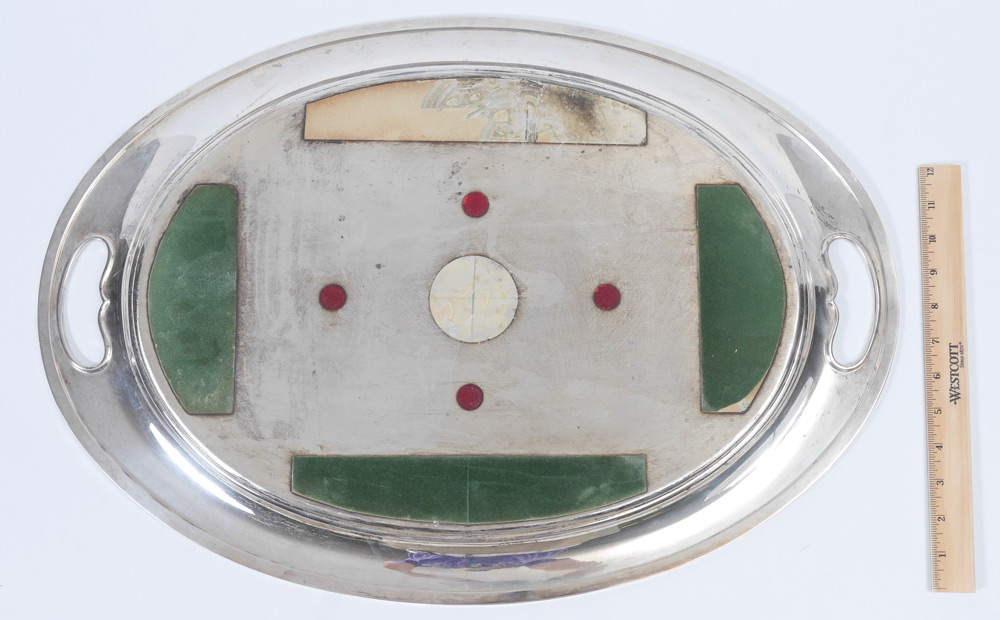 REED & BARTON STERLING PILGRIM TRAY: Sterling tray in the ''Pilgrim'' pattern by Reed & Barton, marked on base with number 750/87, 24 1/2'' x 17''. Approx. 104 troy oz.