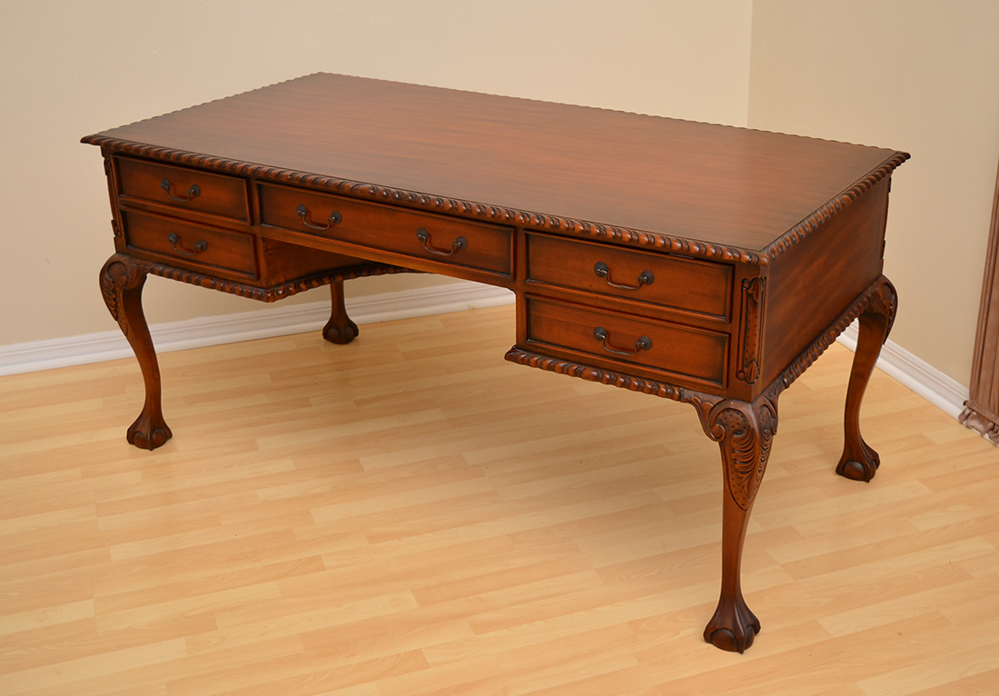 MAHOGANY CHIPPENDALE STYLE EXECUTIVE DESK: 5 drawer desk with gadroon edges, carved cabriole legs ending in ball and claw feet. Measures approx. 30'' tall x 63'' x 32''. Mid to late 20th C.