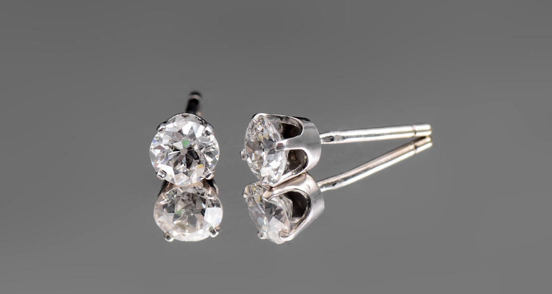 1 CTW DIAMOND STUD EARRINGS: 14K white gold diamond solitaire earrings contain 2 old European round cut diamonds totaling approx. 1.00 Ct., rated VS1 in clarity and H-I in color. The diamonds are prong set. Post and nut closures. Weight: 1.3 grams.