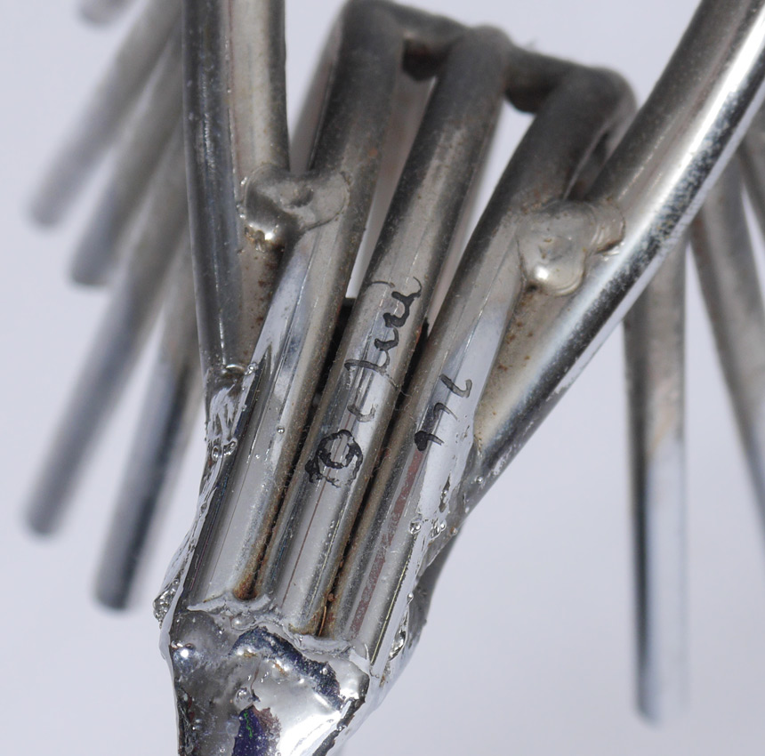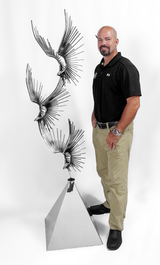 CURTIS JERE THREE EAGLES STAINLESS STEEL SCULPTURE: overall height 73'', affixed to matching pyramid base, signed.