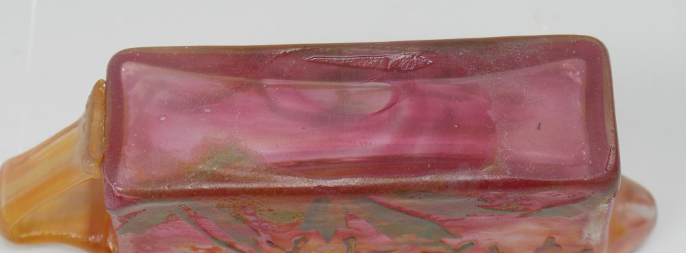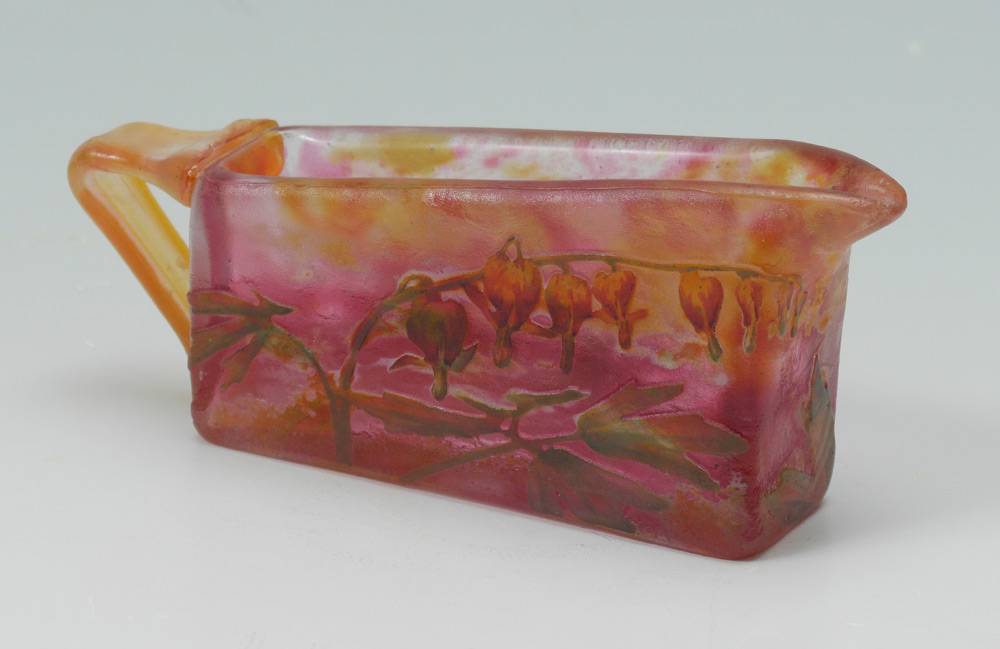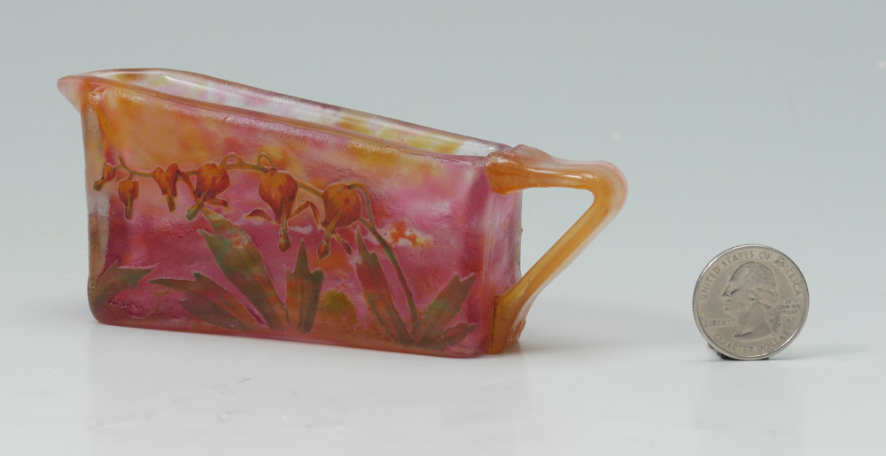 ATTRIBUTED DAUM NANCY CAMEO GLASS CREAM PITCHER: Cameo cut design of bleeding heart flowers on mottled fuchsia and orange ground. Unmarked attribution, 2'' h. x 5 1/8'' x 1 3/8''.