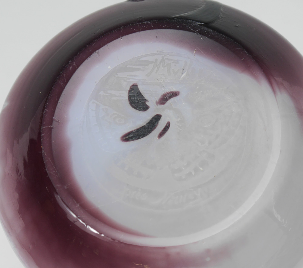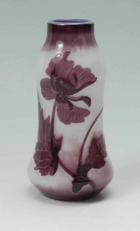 HENRI MULLER CROISMARE CAMEO CUT VASE: Amethyst with white ground with poppy flower or ''pavot'' motif, marked on base with H. Muller Croismare Pres Nancy and butterfly mark. 6 7/8'' h.