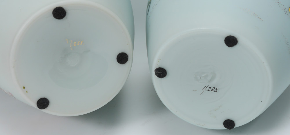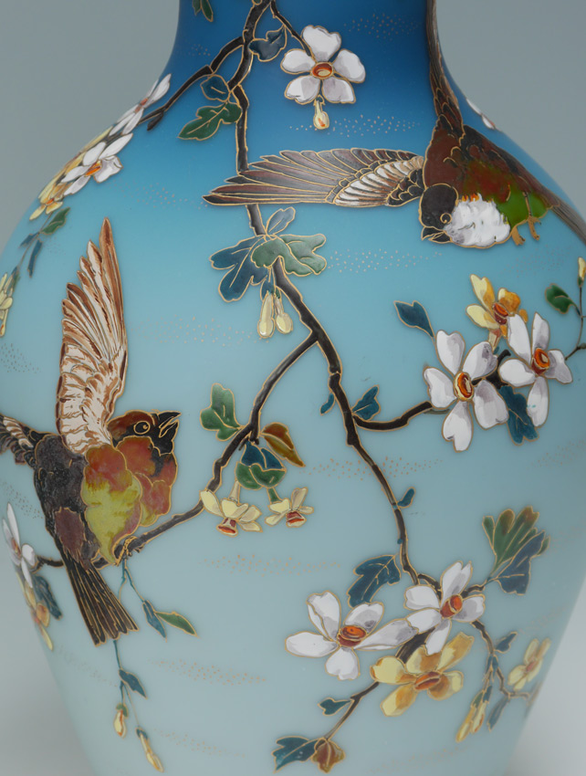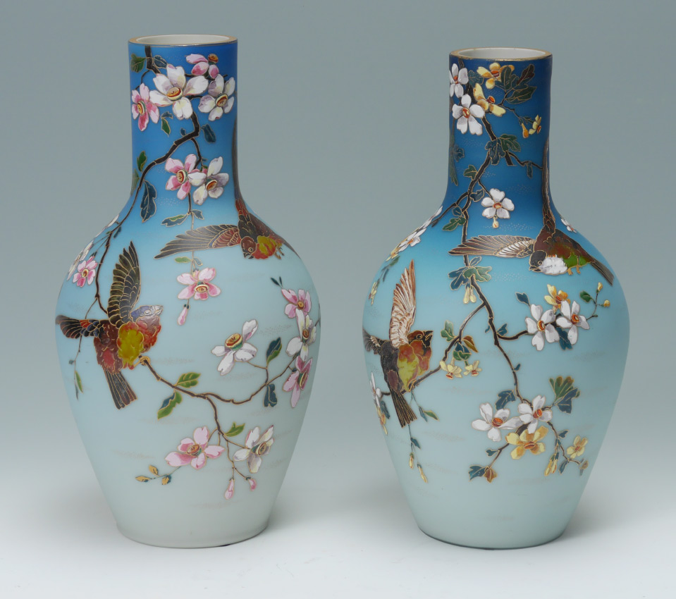 PAIR VICTORIAN BRISTOL GLASS BIRD MOTIF VASES: Similiar but not identical with nicely detail enameled birds on flowing branches motifs, blue graduating to white ground. Marked on base 1/288. Overall measures 16 1/2'' h. x 8 1/2''.
