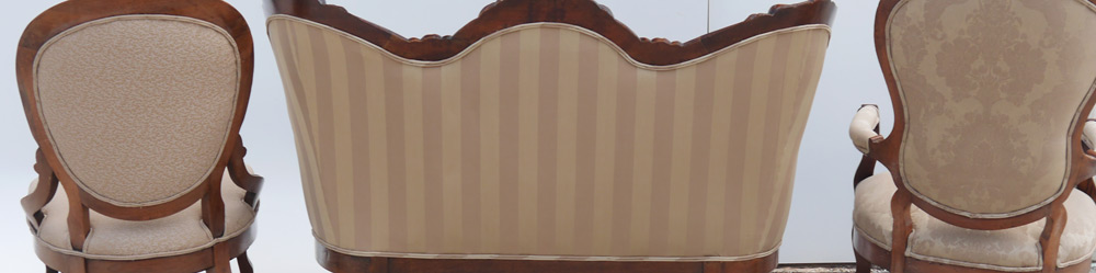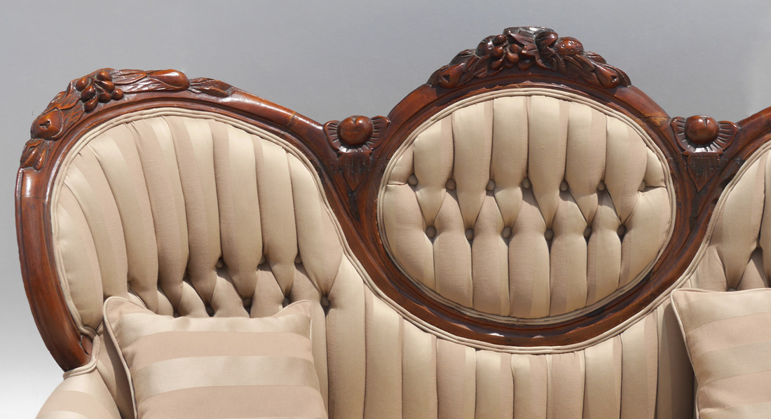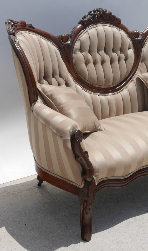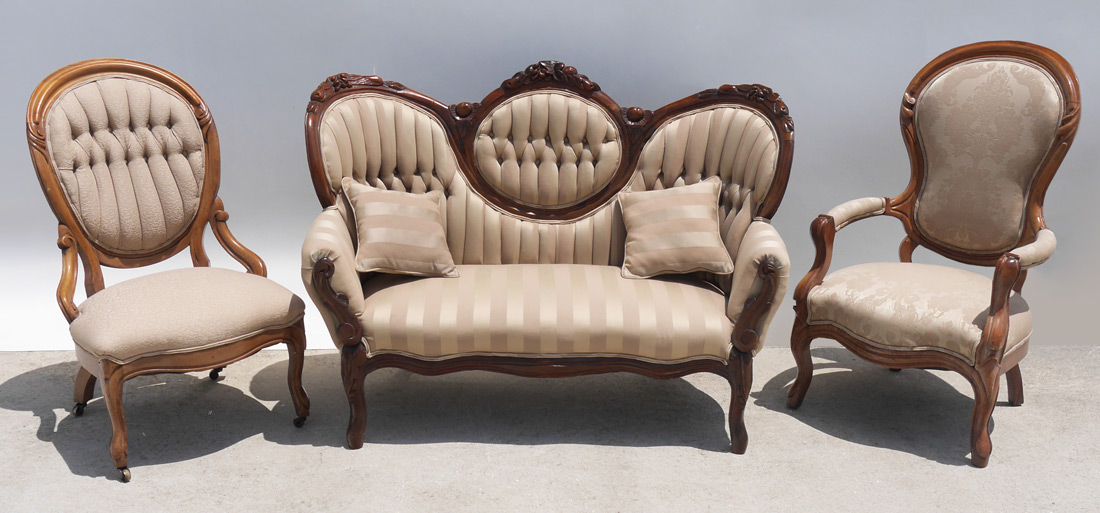 ROCOCO REVIVAL PARLOR SETTEE AND 2 CHAIRS: Carved walnut with button and tufted upholstery. The chairs are a pair, the sofa is carved in a different design. Sofa measures 38 1/2'' h. x 52 1/2'' x 25'', the arm chair 42 1/4'' h. x 26'' x 31''.