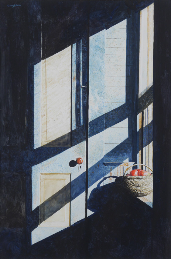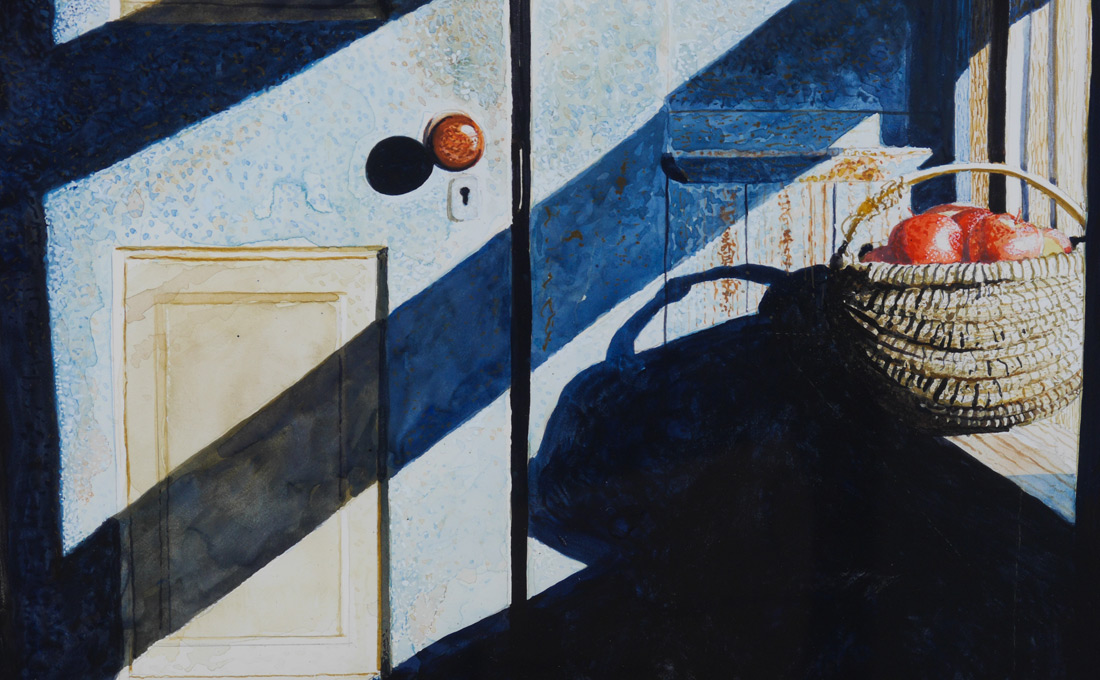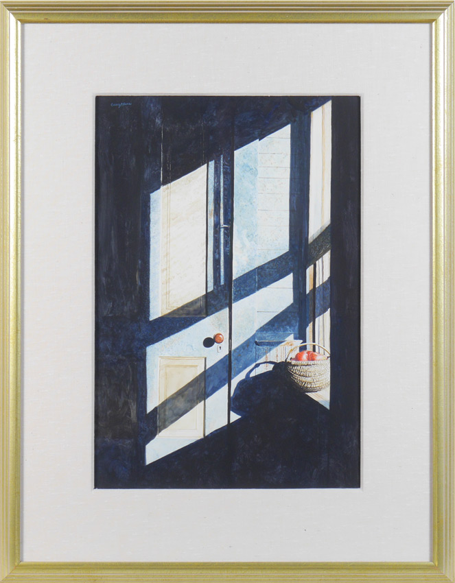 AKERS, Gary, (American, 1951- ): Window Seat with Basket of Fruit, Watercolor/Paper, sight size 20 1/2'' x 14'', signed upper left, framed, 31'' x 24''.