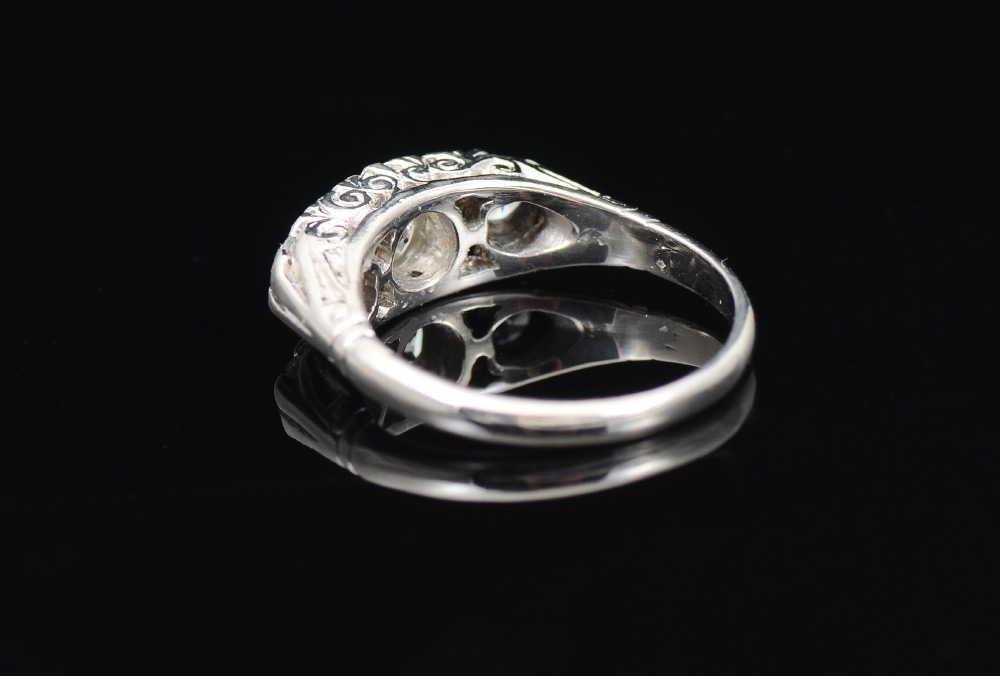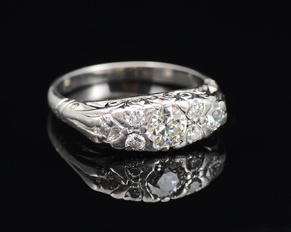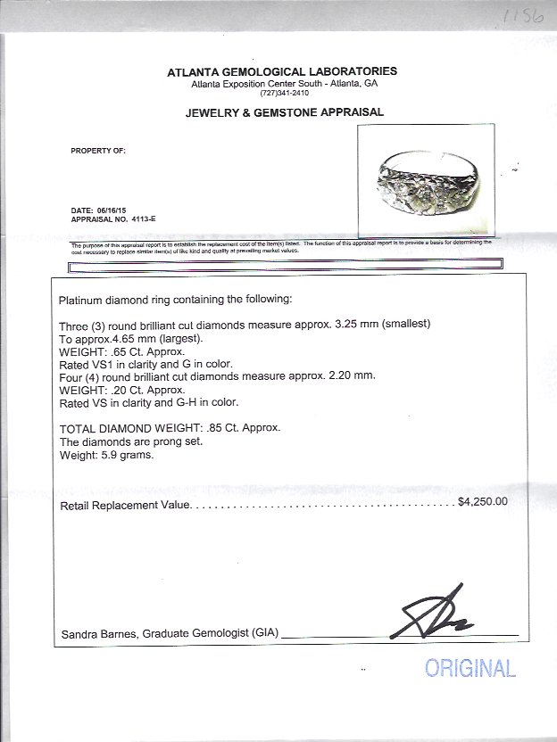 RETRO DECO PLATINUM DIAMOND RING: The three larger diamonds total approx. .65 Ct., the 4 smaller diamonds total approx. .20 Ct. Clarity is rated as VS-VS1 and color G-H. All stones are prong set. Size 5.5. Weight 5.9 grams. Sold with current Atlanta Gemological GIA graduate's appraisal for $4,250.