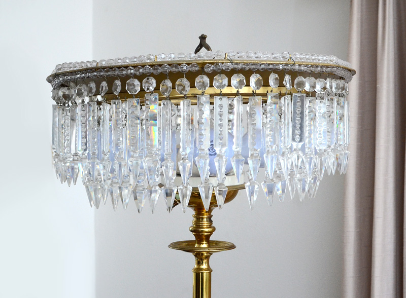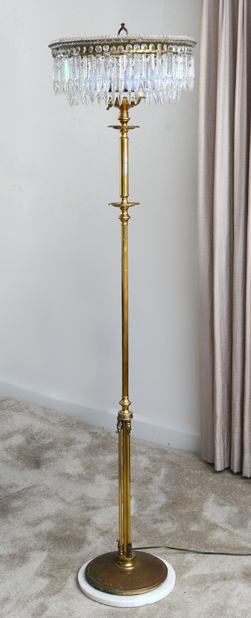 BRASS AND CRYSTAL PRISM FLOOR LAMP: Top shade with 2 rows of beaded garland over 2 tiers of crystal prism drops, 4 light fixture, brass body, marble base. Overall measures 66 1/2'' h. x 16 1/2'' dia.
