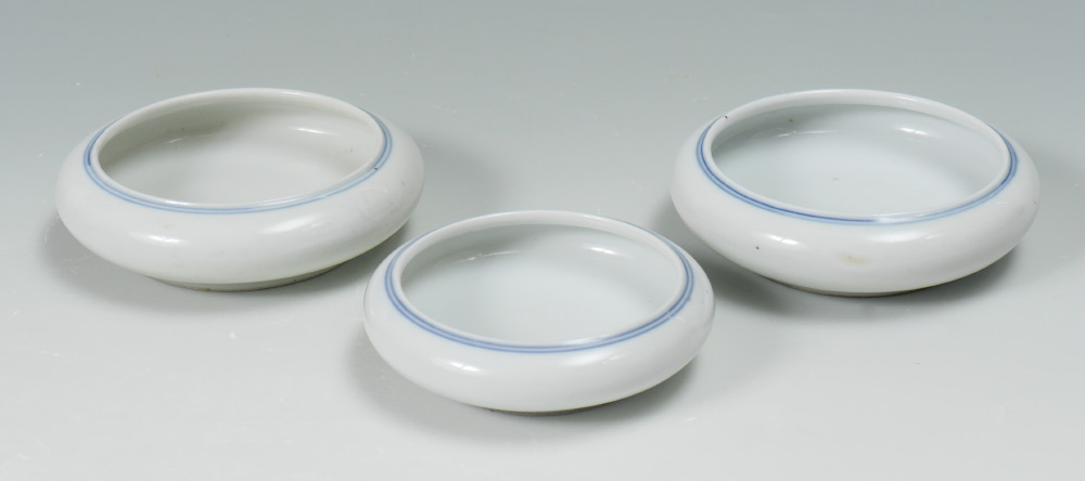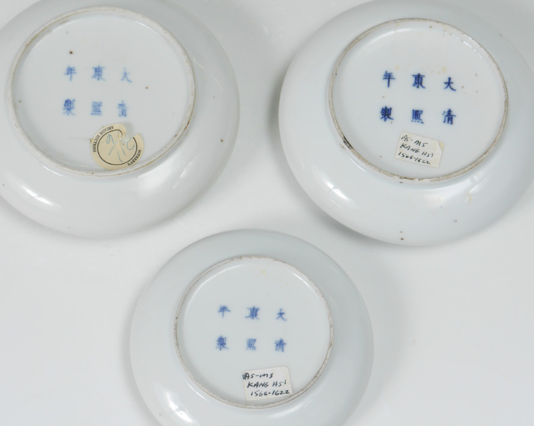 3 CHINESE KANGXI REIGN MARKED LOW BOWLS: Each with simple double blue lined rim, marked on base with qing dynasty, Kangxi reign (1662-1722) 6 character marks, one bearing a old Sotheby's Arcade Auctions label. Largest bowl 1 3/8'' h. x 4 1/2''.