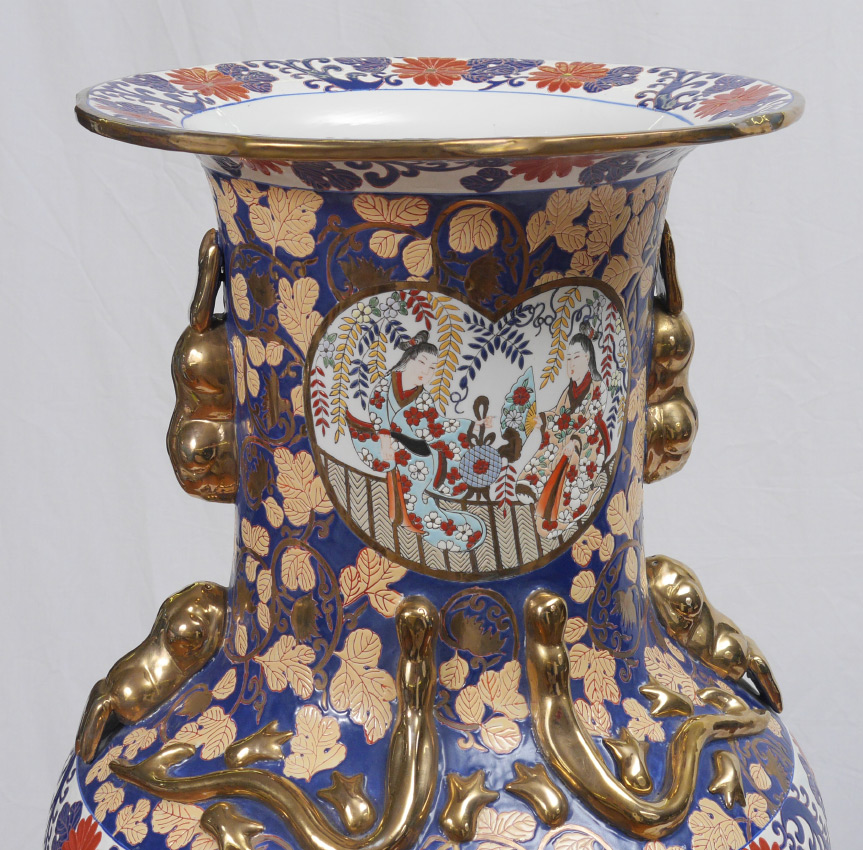 PALATIAL CHINESE POLYCHROME FLOOR VASE: Contemporary vase, polychrome floral decoration with gilt accents, outdoor genre scenes and maidens in reserves. Overall measures 48 1/2'' h. x 19''. Sold with shaped wood stand, 13 1/2'' h. x 21''. For a pair see previous lot 1169.