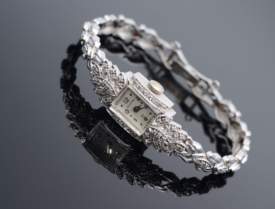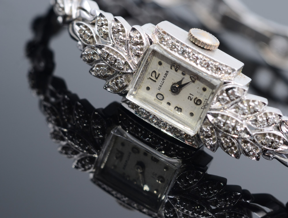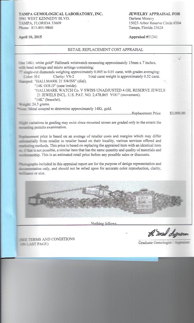 HALLMARK LADIES 14K GOLD & DIAMOND WRISTWATCH: 14K white gold wristwatch with diamonds totaling approx. .52 Ct. averaging VS-2 and H-I color. Swiss 21 jewel movement in working order. The watch and bracelet are both 14K gold. Length 7''. Weight 24.5 grams. Sold with current Tampa Gemological Laboratory appraisal for $3000.