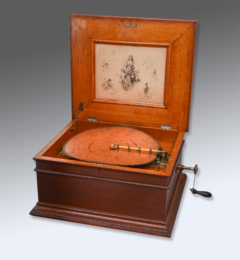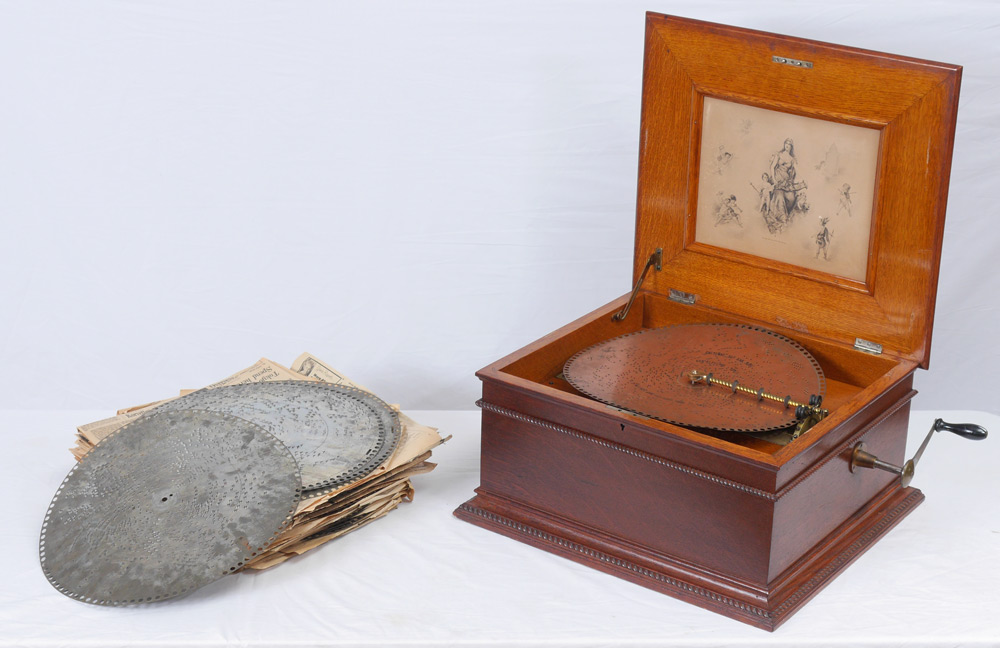 REGINA OAK 15 1/2'' DISC MUSIC BOX WITH DISCS: Oak case with original Regina lithograph inside hinged lid, rope twist and gadroon accents, single comb, serial number 38796, overall measures 12'' h. x 21 3/4'' x 19 3/4''. Sold with approx. forty four 15 1/2'' discs.