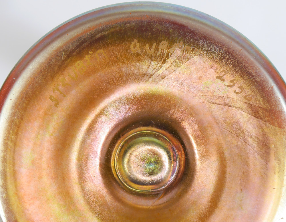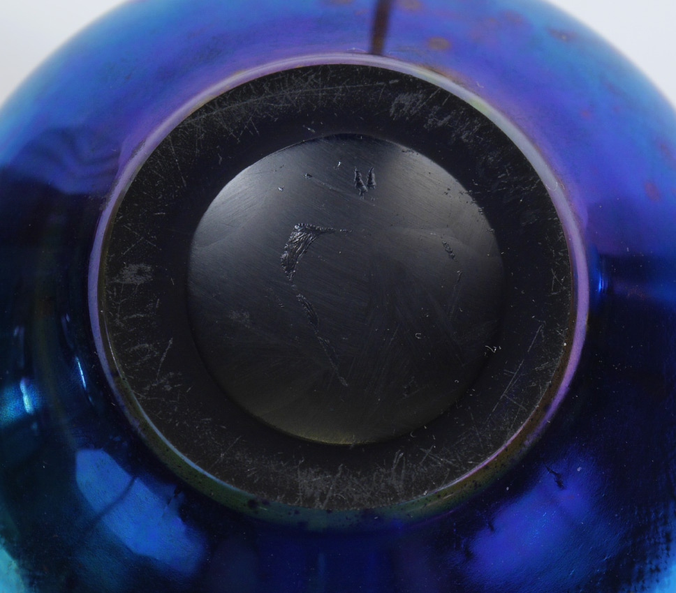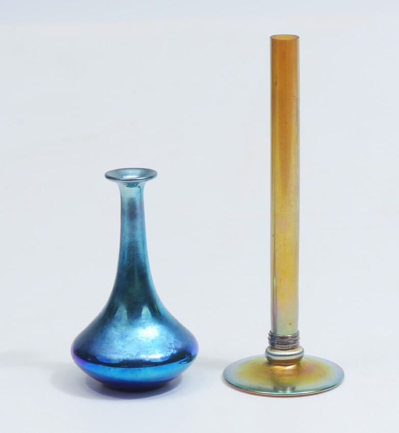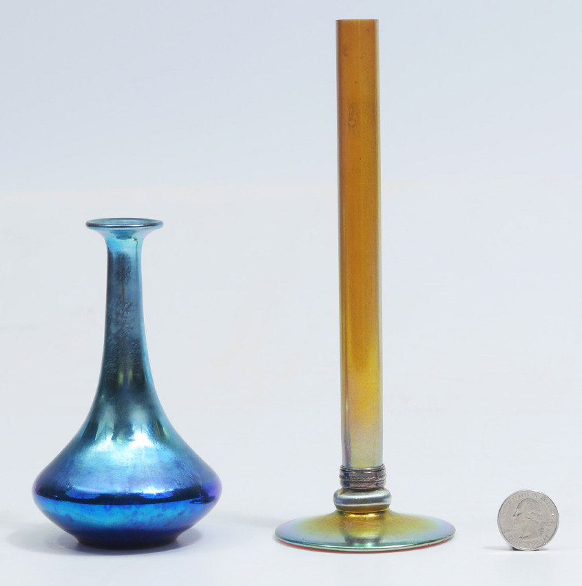 2 STEUBEN AURENE SMALL VASES: 2 pieces total to include 1) Gold stick vase with metal base collar, signed Steuben Aurene 2556. 8 1/4'' h. x 2 7/8''. 2) Diminutive blue vase with flared rim, tapered neck, swell base, traces of Steuben Aurene markings. 5'' h. x 3''.
