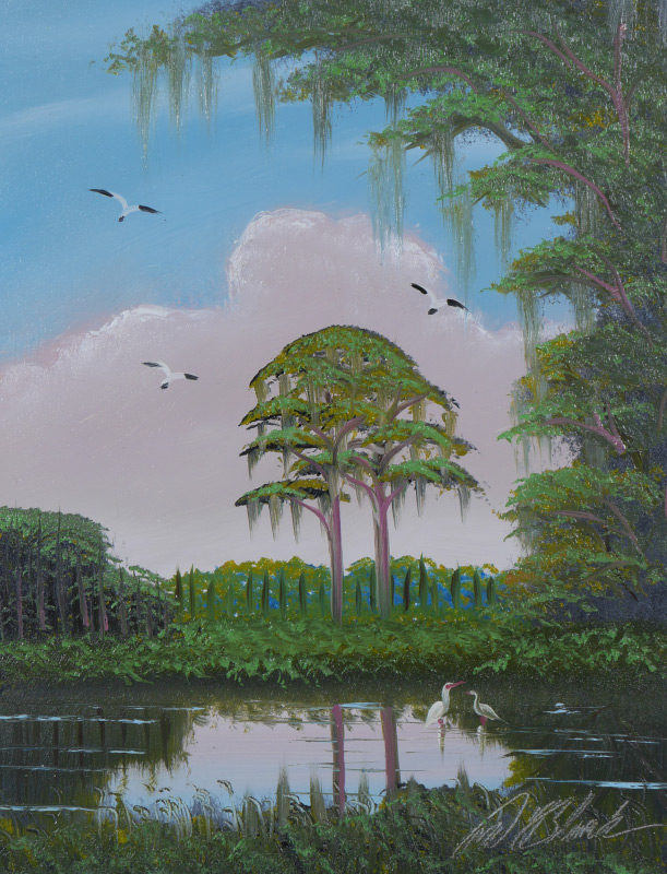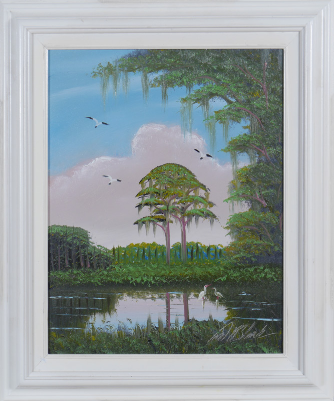 BLACK, Al, (American, 20th Century): Florida Highwaymen Backwaters Scene with Stand of Trees and Birds, Oil/Masonite, sight size 18'' x 14'', signed lower right, framed, 23 1/2'' x 19 1/2''.