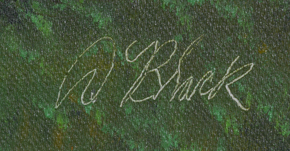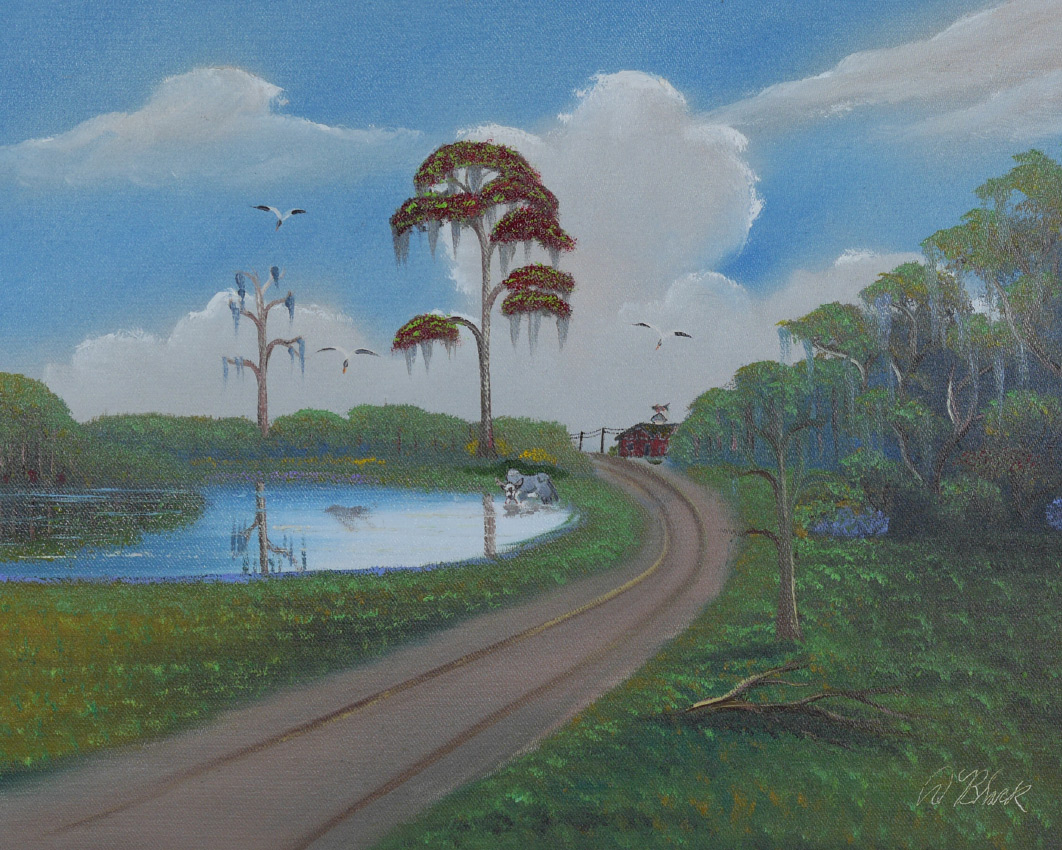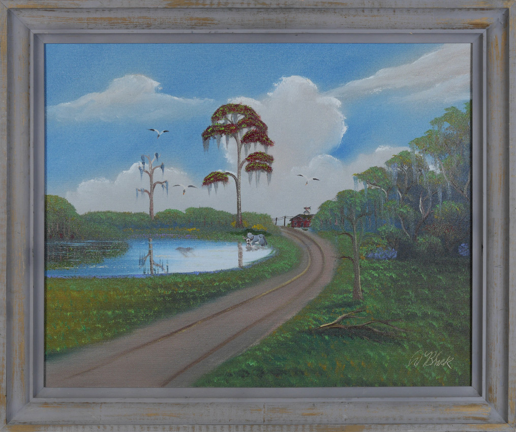 BLACK, Al, (American, 20th Century): Florida Highwaymen Landscape with Fish camp, Cow, and Birds in Flight, Oil/Masonite, sight size 24'' x 30'', signed lower right and dedicated verso, moulding frame 28 1/2'' x 34 1/2''.
