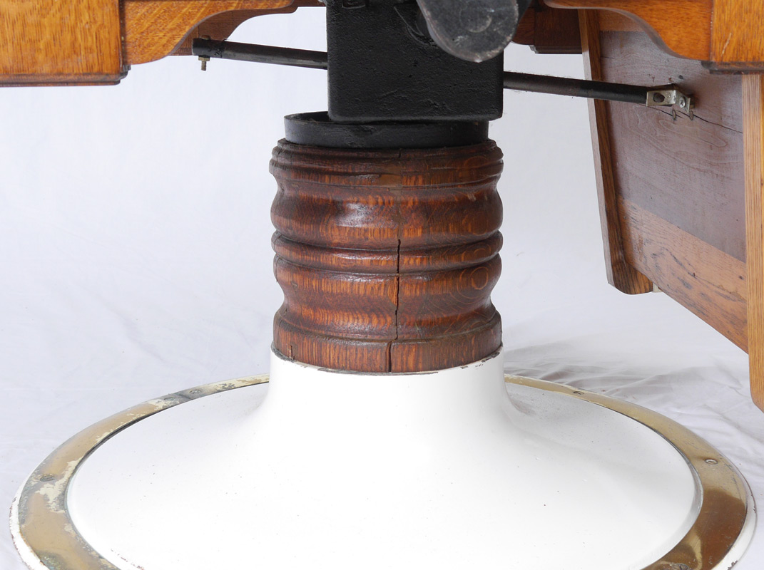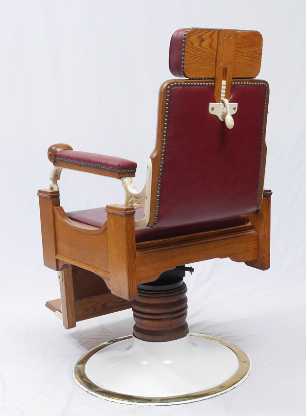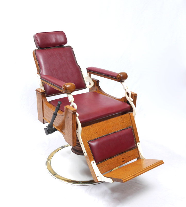 OAK & CAST IRON BARBER CHAIR: Restored, golden oak frame with tacked burgundy leather upholstery, cast iron supports, hinges and base, turned wood accent on column support. Approx. 46'' h. x 27 1/2'' x 38''.