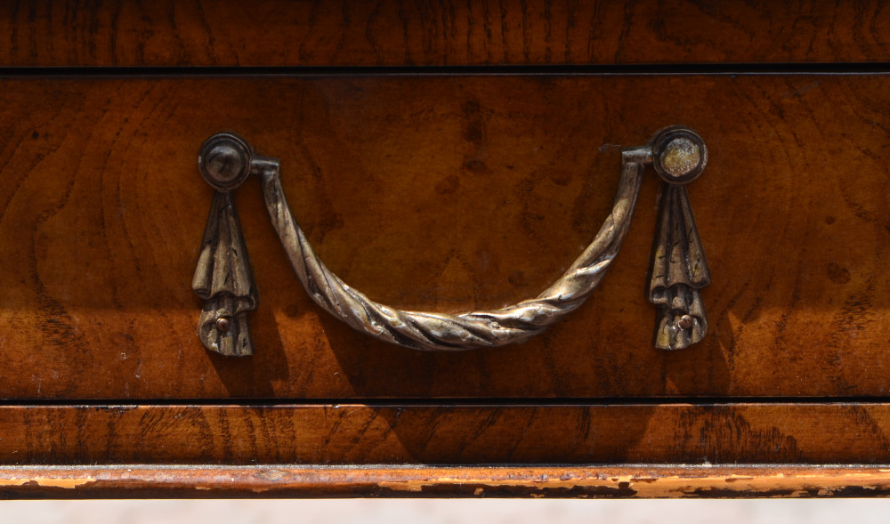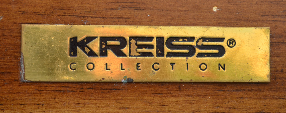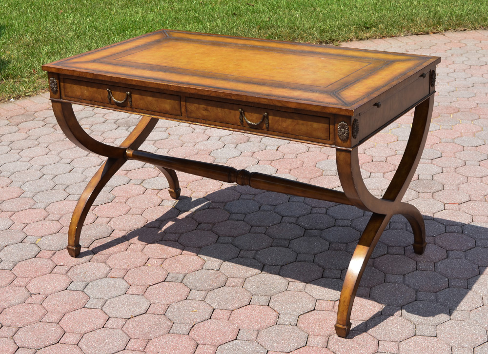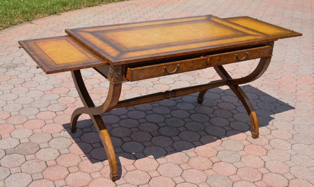 KREISS LEATHER TOP SPIDER LEG DESK: Top with embossed leather panels, 2 slide out extension with matching leather, 2 drawer front, back with 2 false doors. X shaped supports and legs, turned stretcher. Boxing legend Evander Holyfield had the same desk that recently came up for auction. 30'' h. x 48'' x 28''.