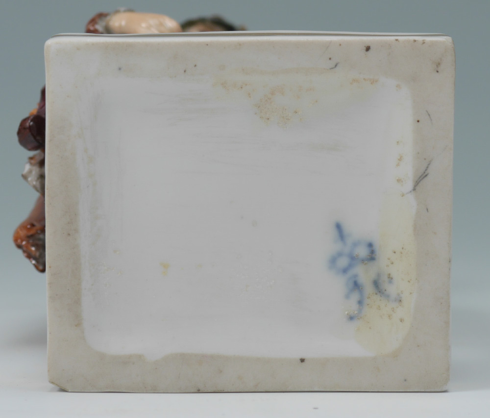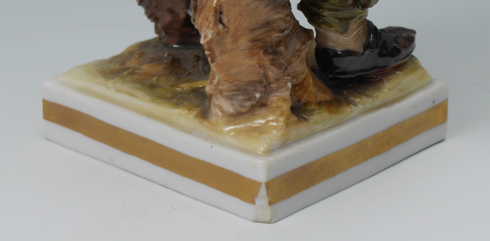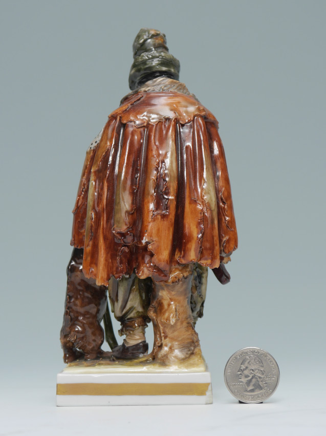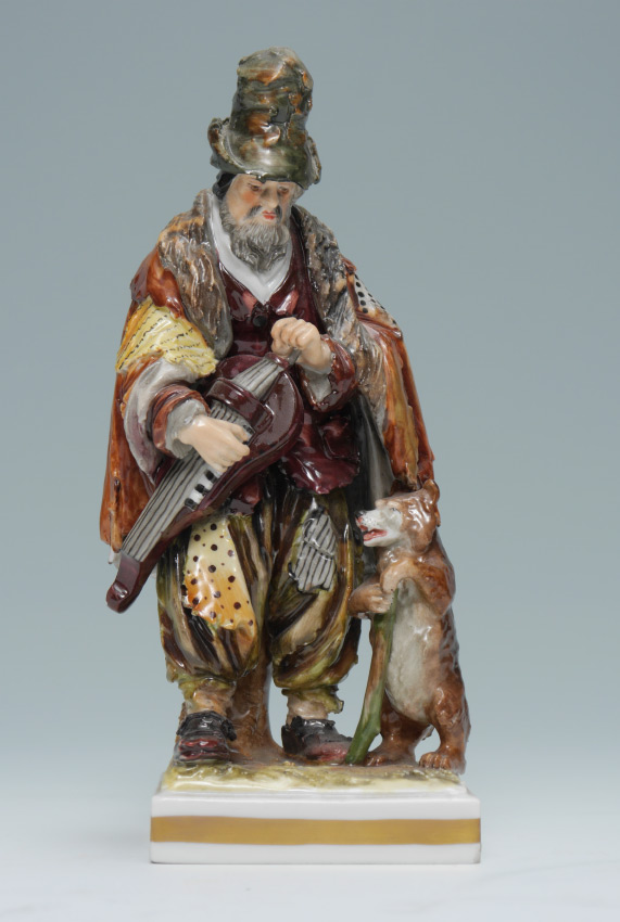 RUSSIAN PORCELAIN FIGURINE CA 1825-1855: Figure depicts a beggar/musician with his bear, 6 3/4'' h. Blue mark on base is shown in Thorn's ''Handbook of Pottery & Porcelain 1944'' and Paulson's ''Guide to Russian Work of Art''.