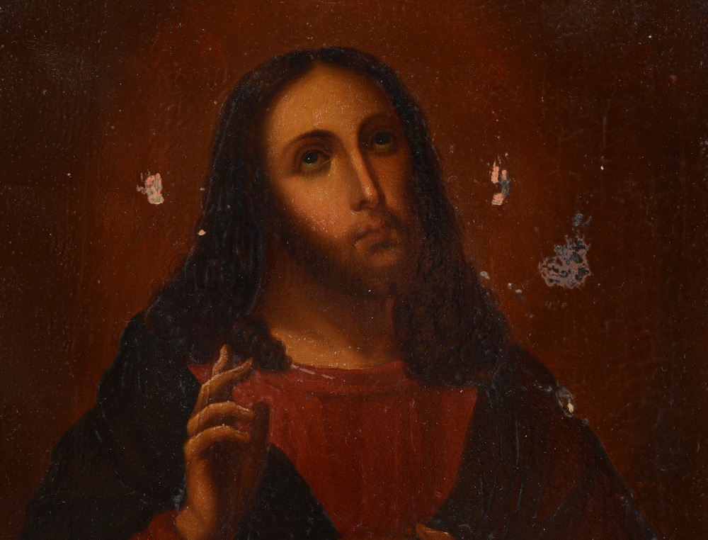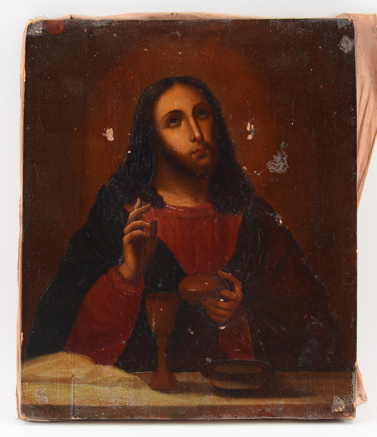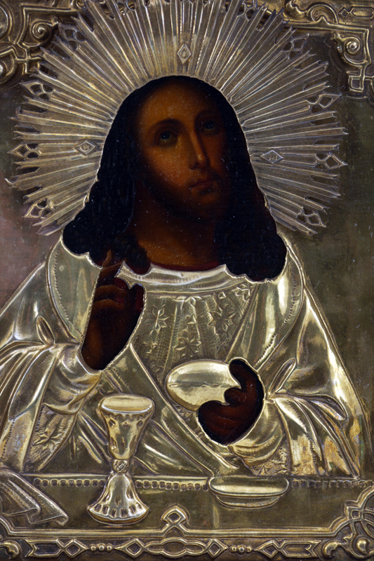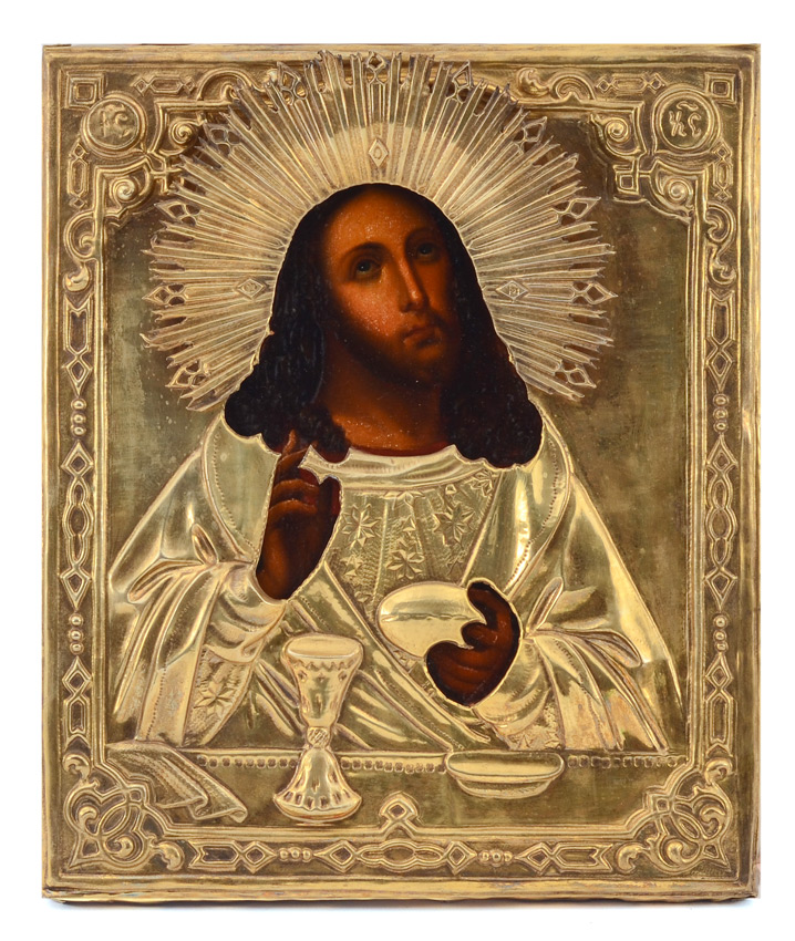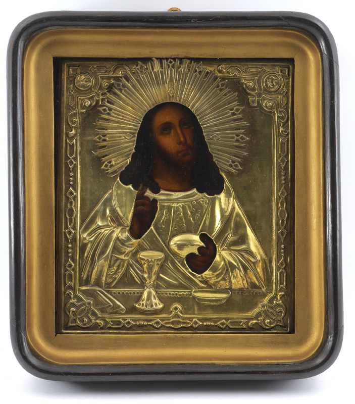 RUSSIAN ICON IN SHADOW BOX FRAME: 12 1/4'' x 10 1/4'', gold flashed metal okblad, ebonised shadow box hinged frame, 15'' x 13'' x 3'', illegible cyrillic cursive verso, age unknown, possibly late 19th, early 20th century.