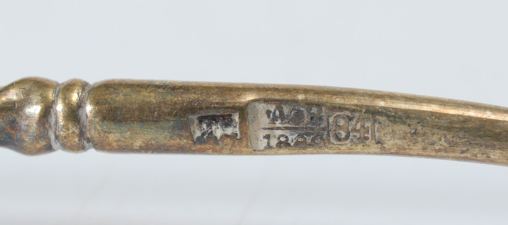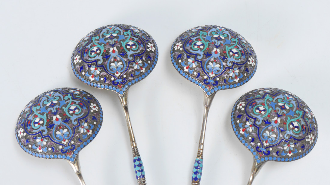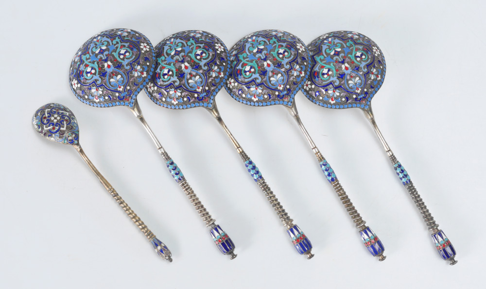 5 RUSSIAN SILVER ENAMEL SPOONS: 4 illegibly marked with 1888 Moscow 84 zoltonik mark and makers mark, floral motif enamel, twist handle with with enamel decoration. 7'' long. The 5th smaller spoon also illegibly marked with 84 zolotnik mark, 4 5/8'' long. Approx. 10.1 troy oz inclusive of enamel.