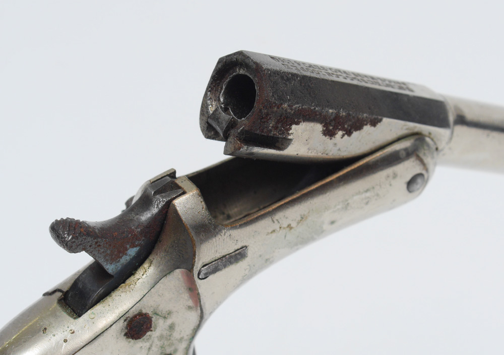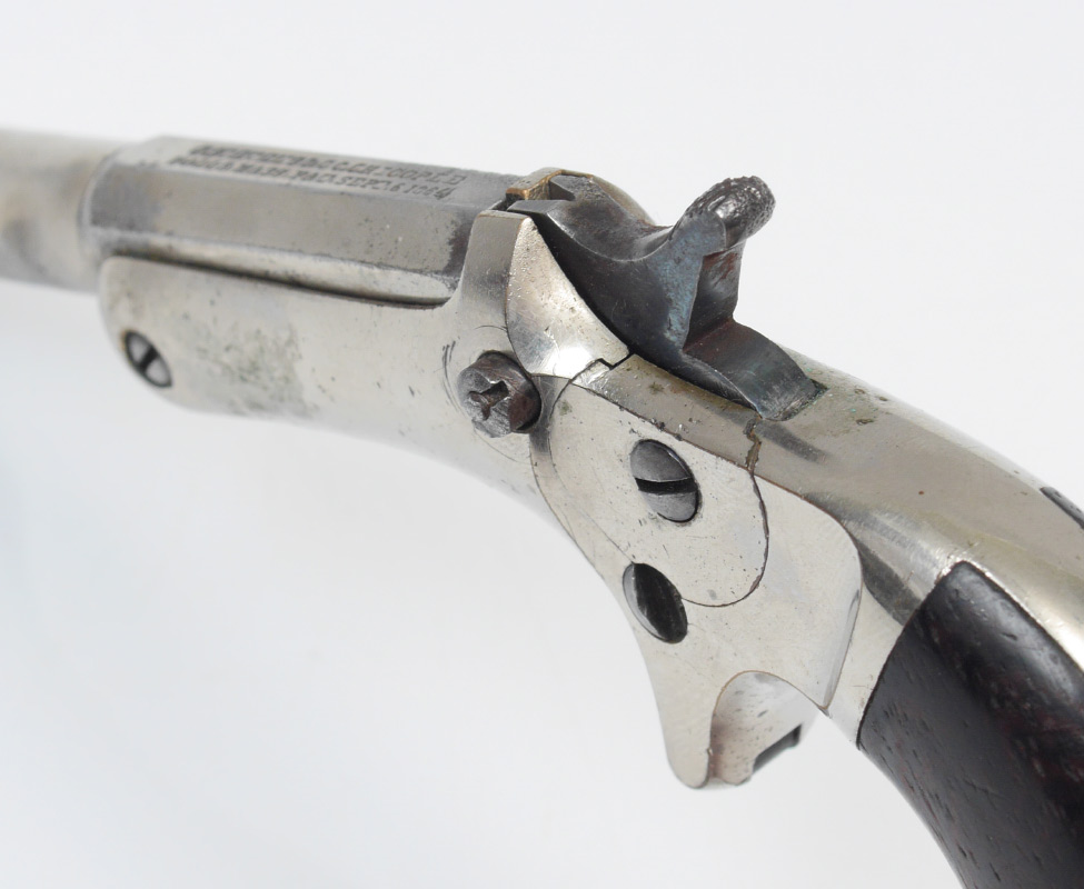 J. STEVENS ARMS ANTIQUE OLD MODEL POCKET PISTOL: Antique pistol with 3 1/2'' part octagon, part round approx 22 cal. barrel marked J. Stevens A & T Co. Chicopee Falls Mass Pat. Sept. 6 1864. Wood grips. Nickel frame with some nickel loss. Break front action nice and tight.
