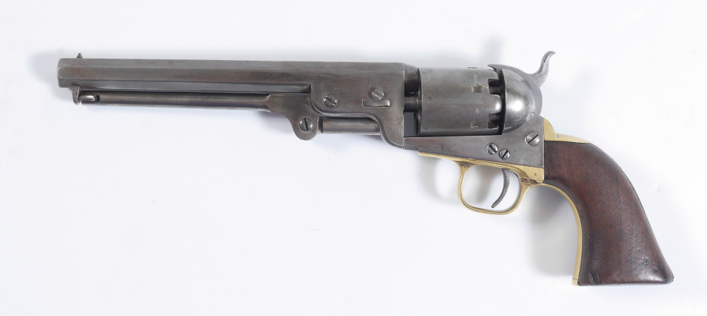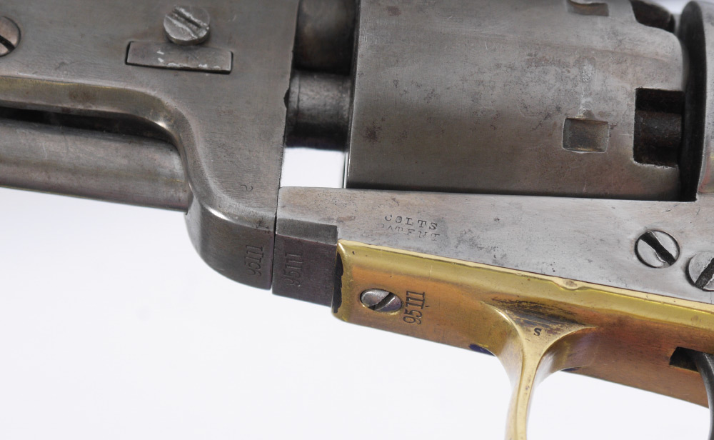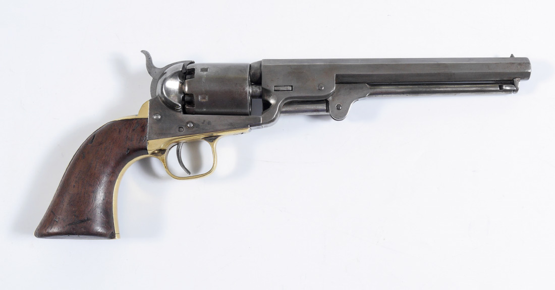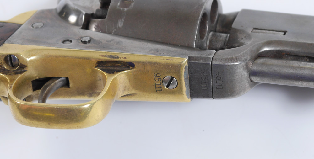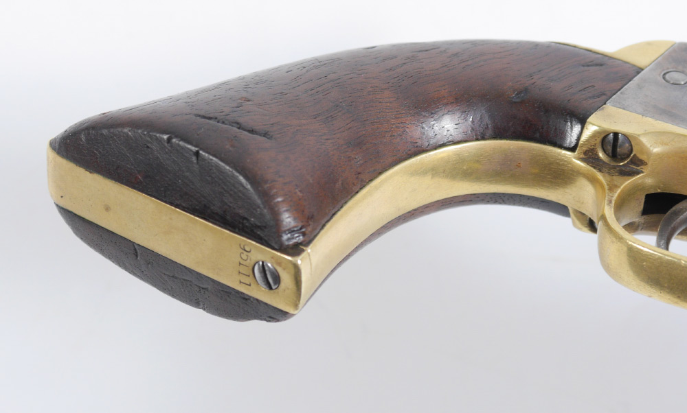1861 COLT MODEL 1851 NAVY REVOLVER: 4th Model, serial number 95111 dates to 1860. 7 1/2'' octagonal .36 caliber barrel with partial Samuel Colt Hartford address line, 6 shot cylinder, no scene. Walnut grips, brass trigger guard and back strap. Action currently works fine. Overall 13 1/2'' long.
