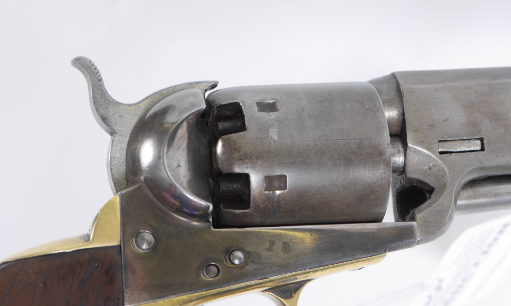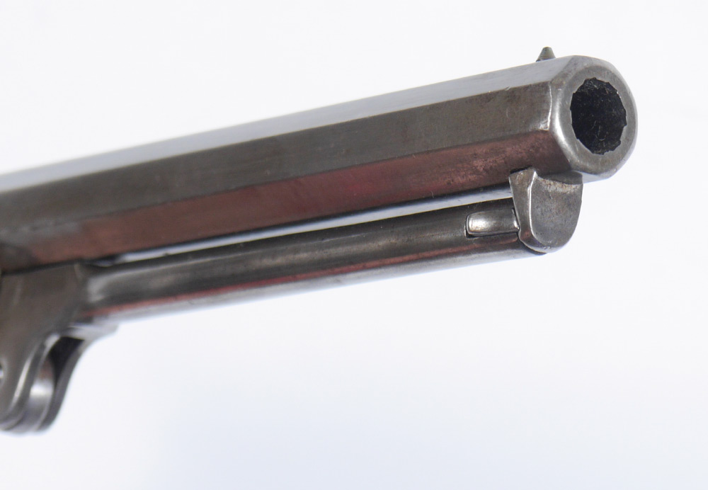 CONDITION: Metal has been cleaned at some point years ago, traces of Colt address remain. Serial numbers on frame and guard nice. Chips to grips. BURCHARD GALLERIES DOES NOT ENDORSE THE FIRING OF ANY ANTIQUE FIREARM.