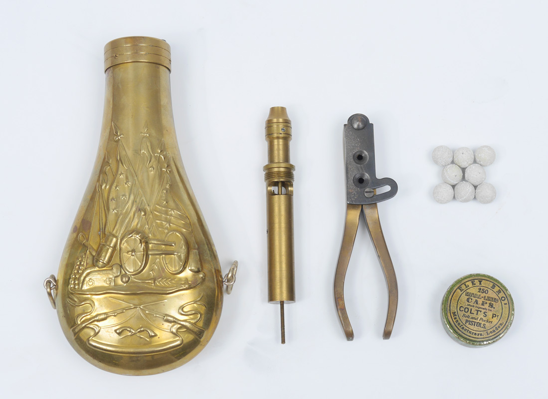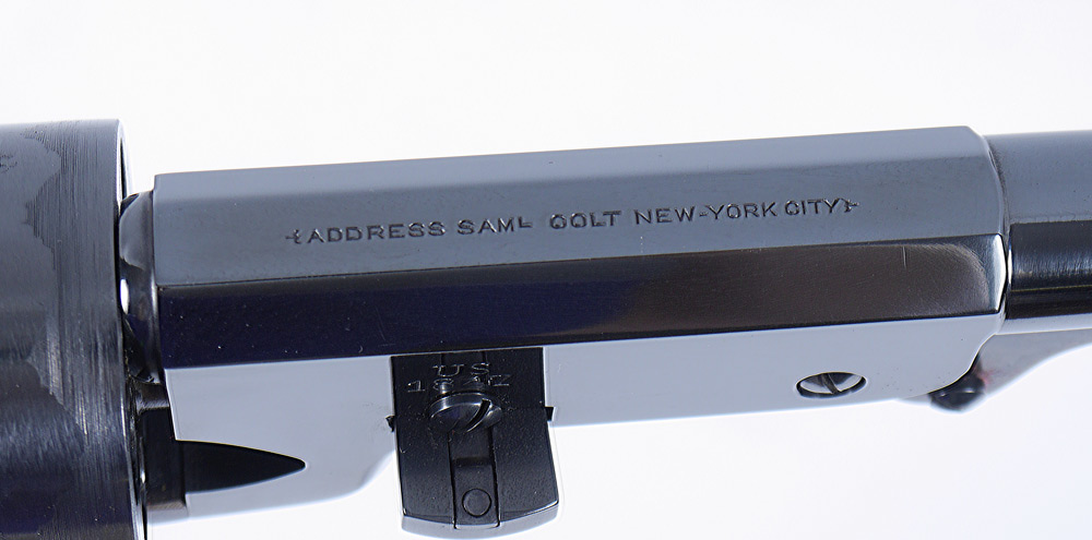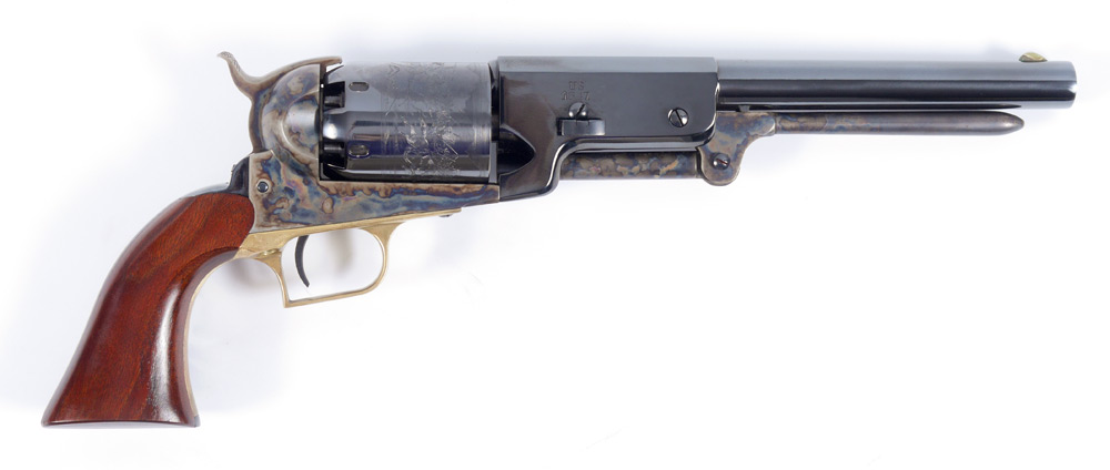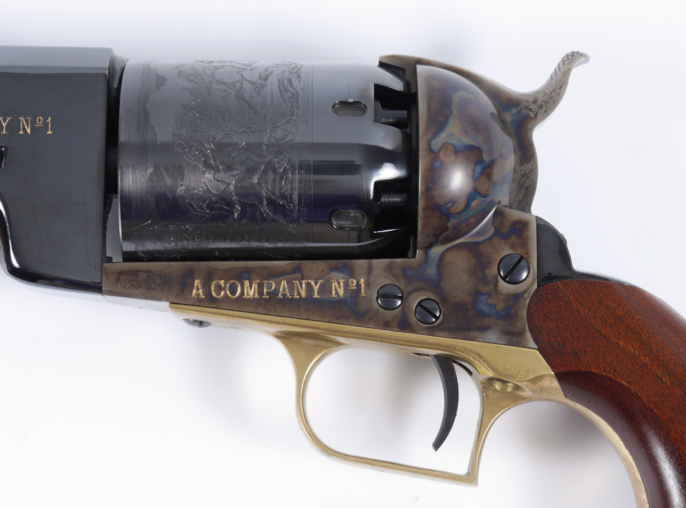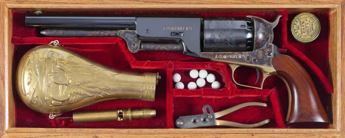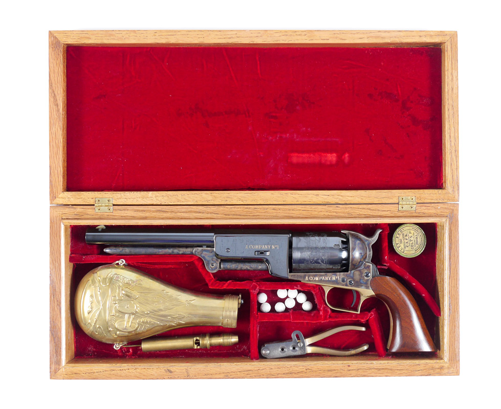 COLT SIGNATURE SERIES WALKER REPRODUCTION PISTOL: 150th Anniversary blackpowder reproduction of the famous Colt ''Walker'' .44 caliber 6 shot revolver, engraved cylinder scene, gold engraved ''A Company No. 1'' on frame, cylinder and barrel lug. Sold with presentation case with accessories, 2 3/4'' h. x 18'' x 7 3/4''. No paperwork.