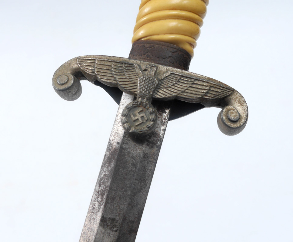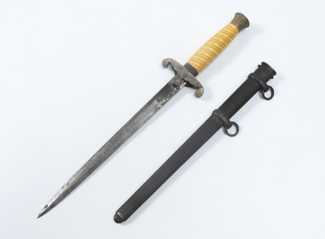 WWII GERMAN ARMY OFFICERS DAGGER: Hilt with foliate pommel, ivorine grip, spread eagle cross guard with emblem. Unmarked 10'' blade, metal scabbard. Overall measures 15 3/4'' long.