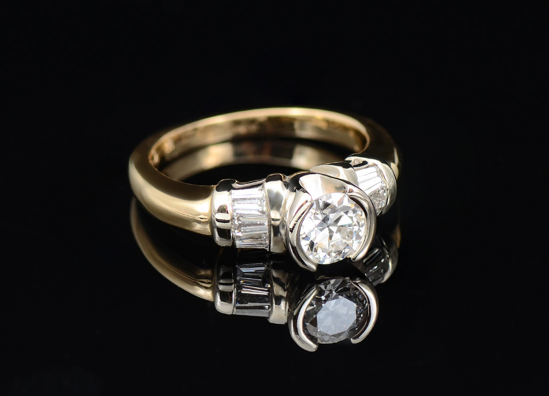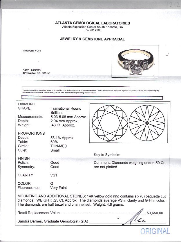 DIAMOND ENGAGEMENT RING: A contemporary 14K yellow gold ring centering an approx. .46 Ct transitional round brilliant diamond of VS1 clarity and G color. At the sides are 6 baguette diamonds totaling .25 Ct., and averaging VS clarity and G-H color. Stones are half bezel and channel set. Size 4. Sold with current Atlanta Gemological GIA graduate's appraisal for $3,650.