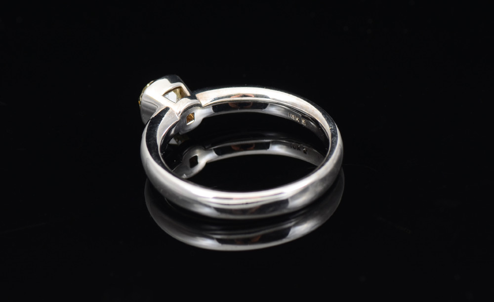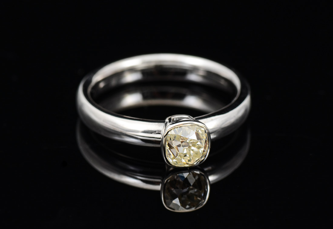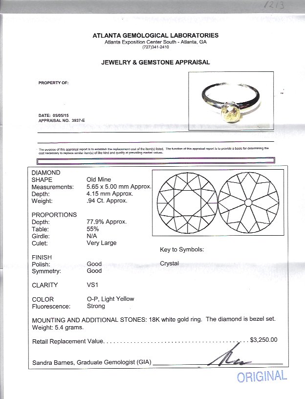18K DIAMOND SOLITAIRE RING: 18K yellow gold ring with a solitaire .94 Ct old mine cut diamond of VS1 clarity and light yellow color. Bezel set. Sold with current Atlanta Gemological GIA graduate's appraisal for $3,250.