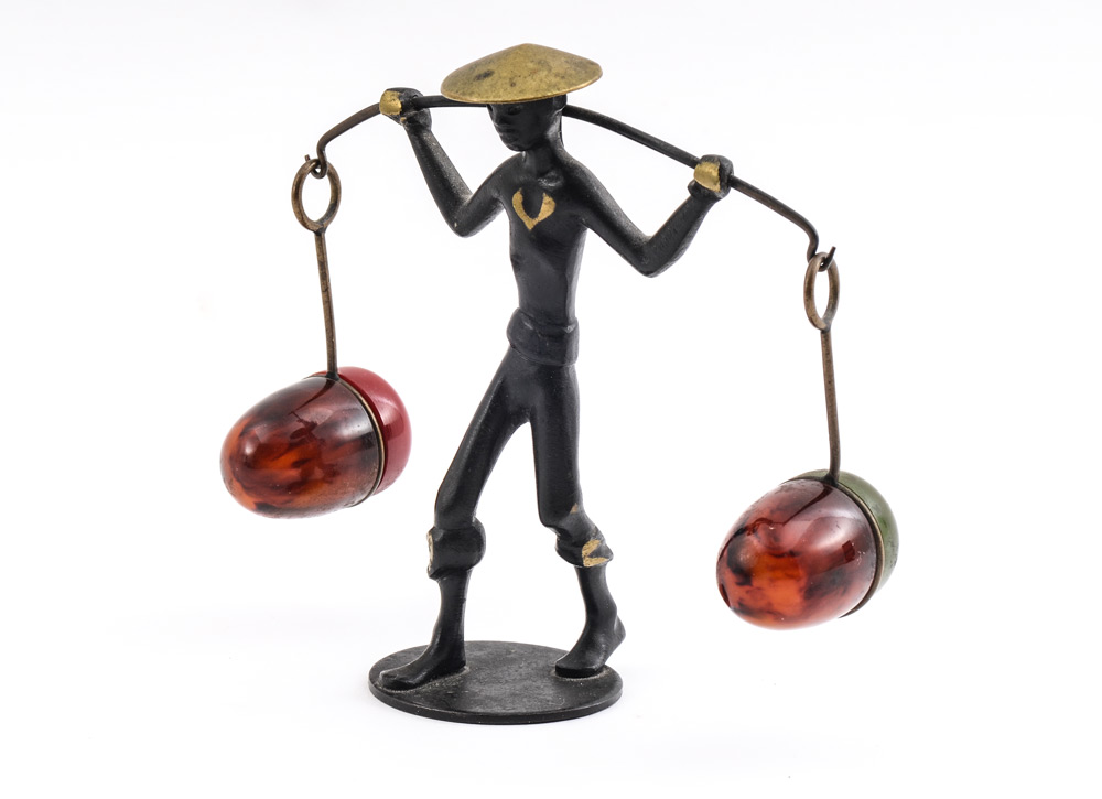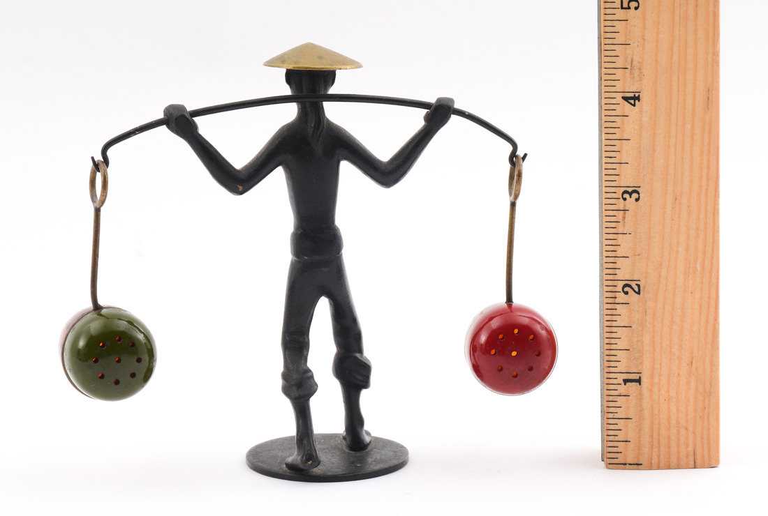 RICHARD ROHAC BRONZE & BAKELITE SALT & PEPPER SET: Figure of an Asian man holding a yoke, carrying 2 Bakelite salt & pepper shakers. Signed on base RR and Made in Austria. Overall figure measures 4 1/2'' h. x 4 1/2'' x 1 3/4''.