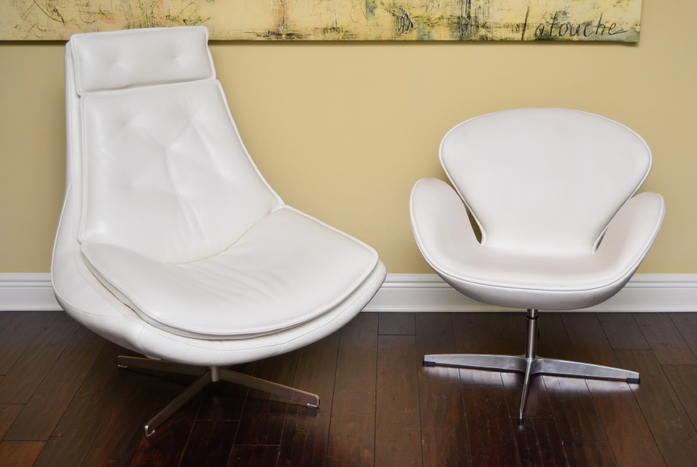 2 MODERN WHITE LEATHER CHAIRS: 2 contemporary chairs to include 1) The Williams swivel accent chair from Scan Design, 39 1/2'' h. x 36'' x 36''. 2) Swivel arm chair, 30 1/2'' h. x 28'' x 27''.