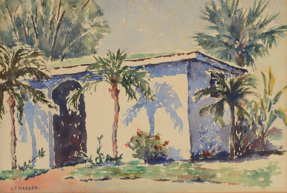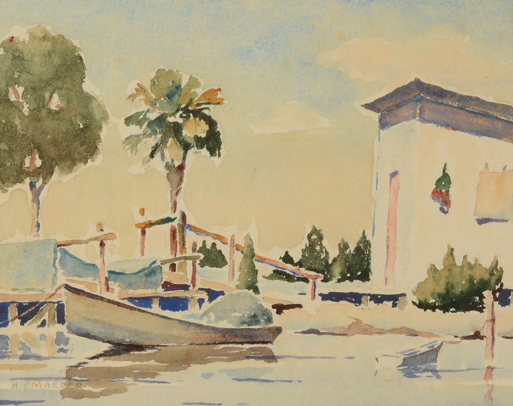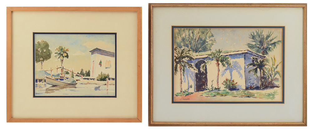 MAEDER, Howard Potter, (American, 1886-1983): 2 signed Maeder watercolors to include 1) Ranch with Palms, 8 1/4'' x 12'' sight size, framed 14'' x 18''; 2) Rowboat at Dock, 7'' x 9'' sight size, framed 13 1/4'' x 15 1/4''. Howard P. Maeder Sr. Family Estate.