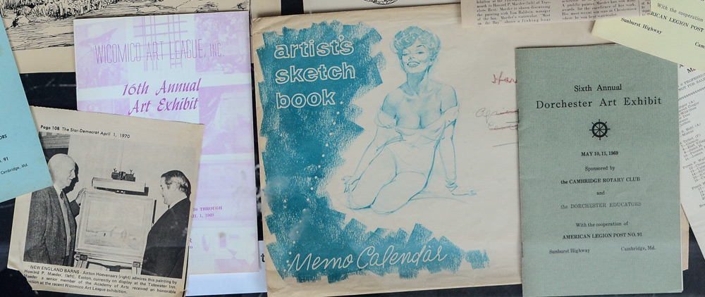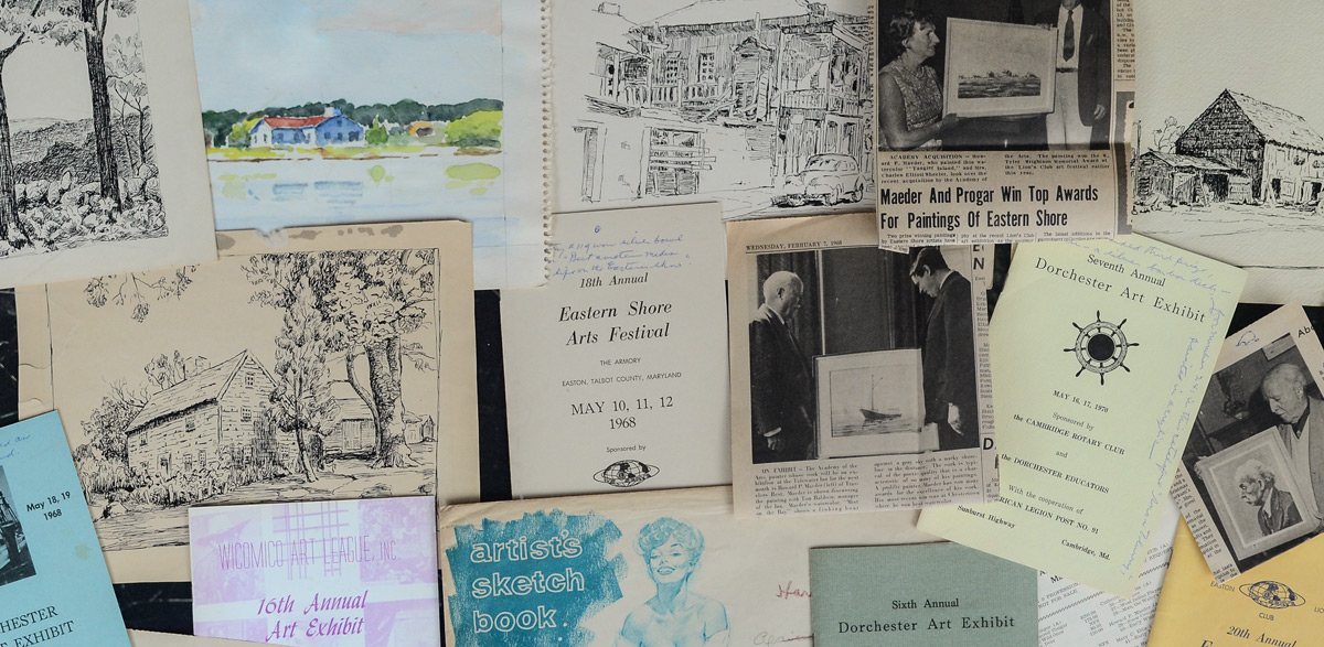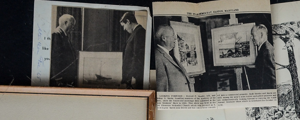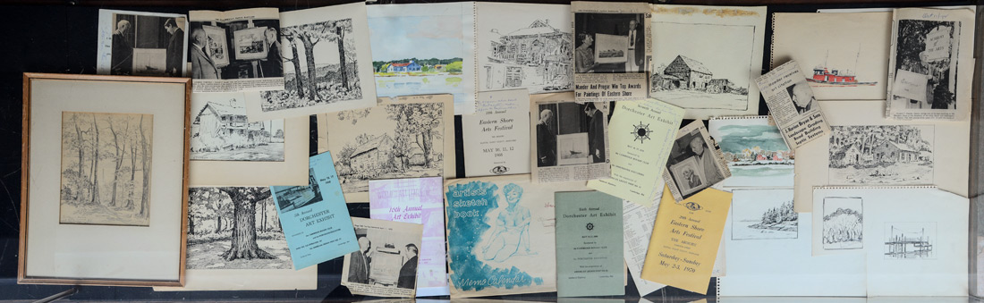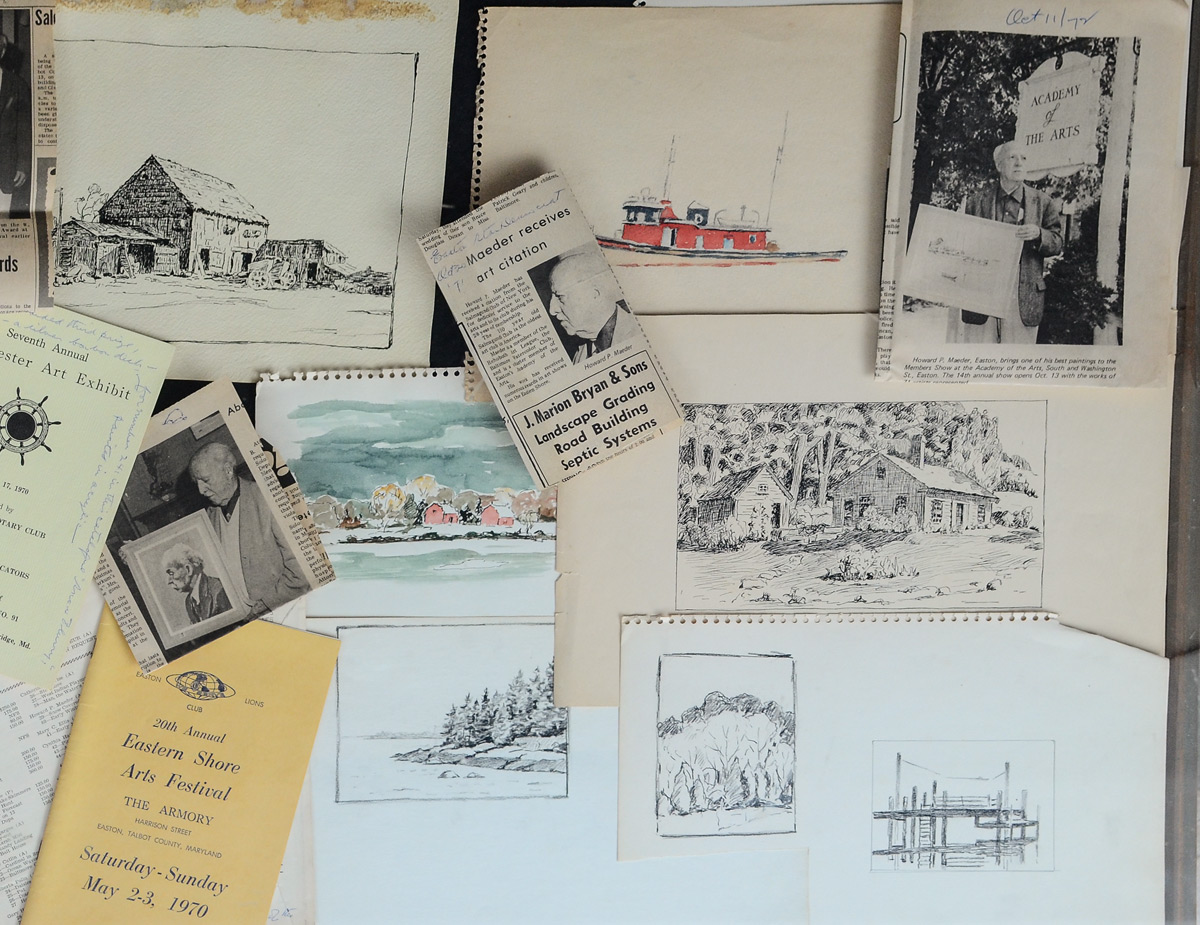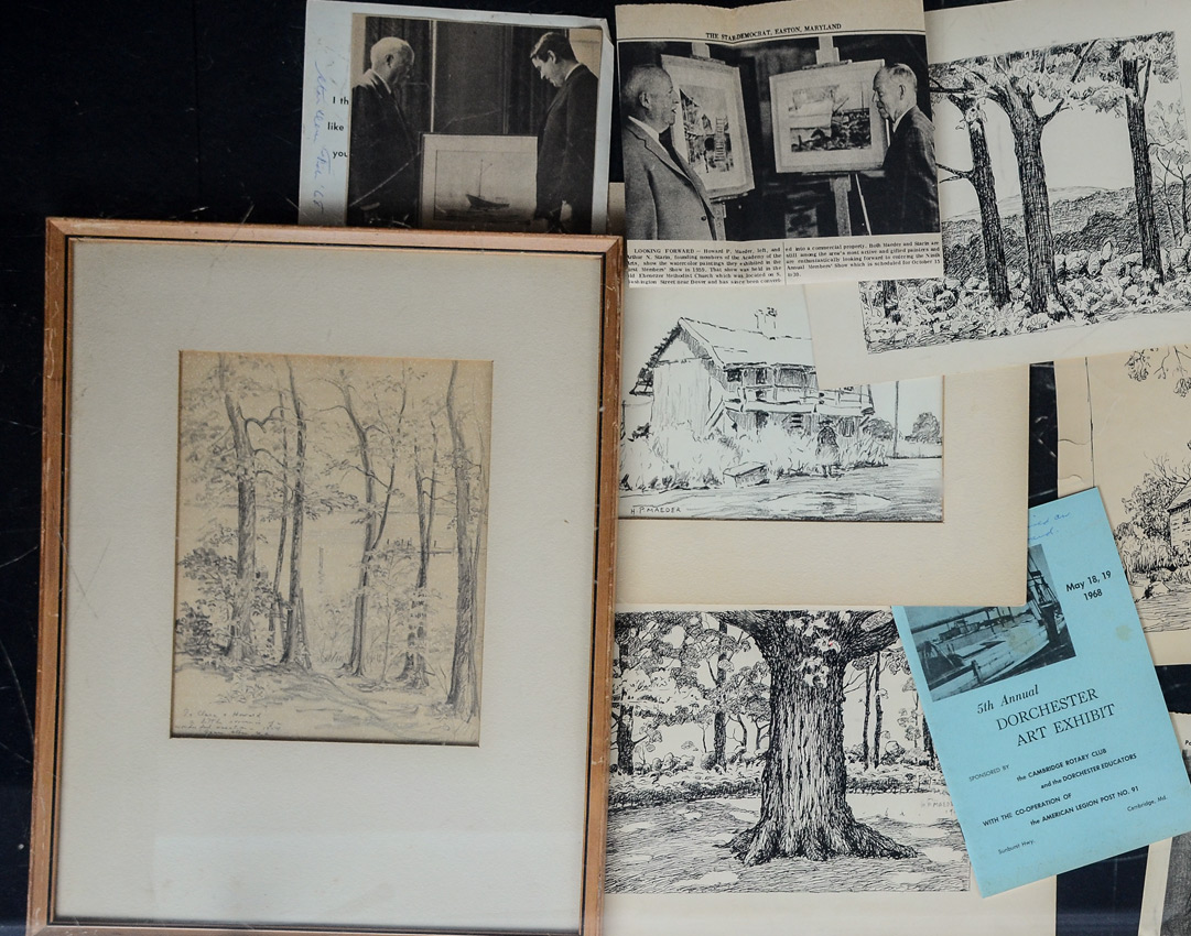MAEDER, Howard Potter, (American, 1886-1983): Large lot of Howard P. Maeder ephemera to include pencil drawings, artist sketches, etchings, prints and misc. art exhibition brochures and newspaper articles. Maeder was a member of the Salmagundi Club and along with artist Arthur N. Starin and 4 others founded The Academy of the Arts in Easton, MD. in 1958. Howard P. Maeder Sr. Family Estate.